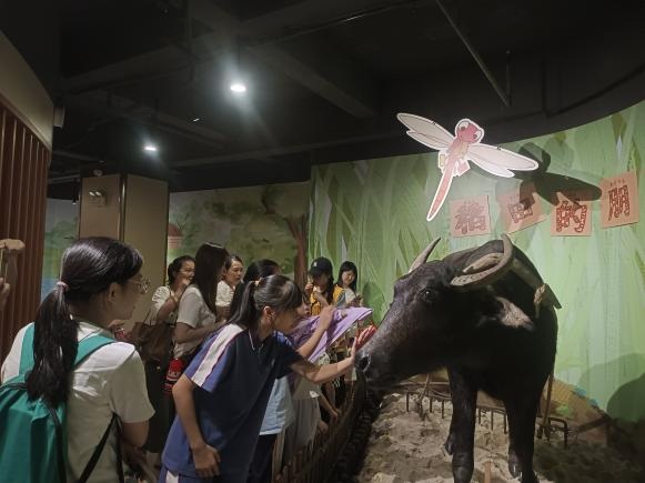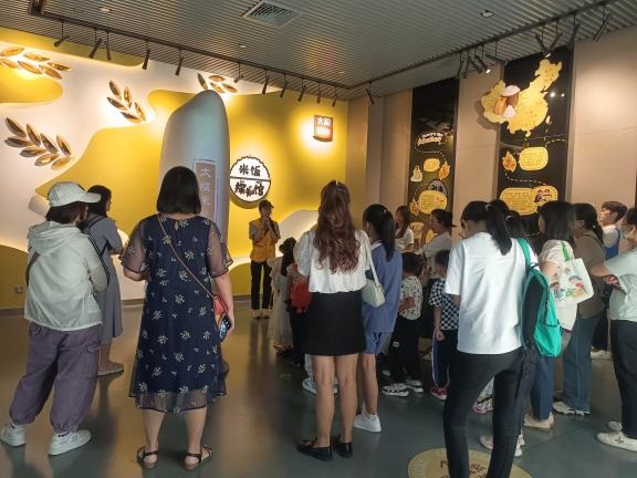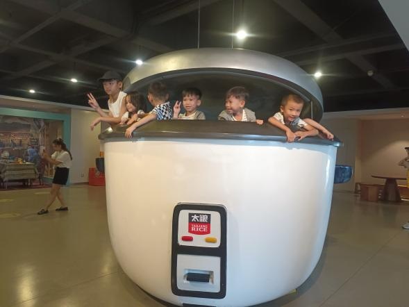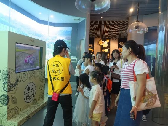 来到米饭探知馆,首先映入眼帘的是一粒巨型的纯白米雕。紧接着,工作人员通过一首《悯农》带大家走进了米的世界,讲解了稻米文化的发展史,让大家了解到我们吃的“饭”是怎么来的。在米饭探知馆的讲解员带领下内,大家通过互动投影、仿真模型展示、知识墙等了解米饭的相关知识。从“粒粒皆辛苦”的水稻种植、收获、变成餐桌上的米饭,到农具发展历程的认识,再到中国现代大米生产、培育等,大家在一粒米的故事里大开眼界。