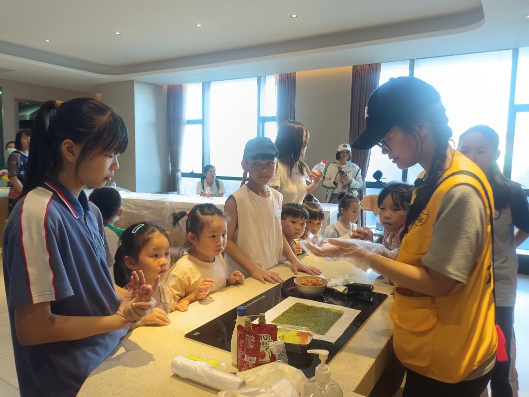 除了参观外,大家还体验了DIY米饭汉堡环节。工作人员讲解和示范制作米饭汉堡后,孩子们跃跃欲试,开始迫不及待地实践起来。戴上手套,先准备一点米饭平铺在海苔上面,接着给米饭抹上沙拉酱,然后把火腿、黄瓜、肉松放上去,最后卷起来。孩子们在妈妈的协助下制作出一份份香喷喷的米饭汉堡。这不仅锻炼了孩子们的动手能力,还他们让更加深刻体会到美食来之不易,懂得珍惜粮食。