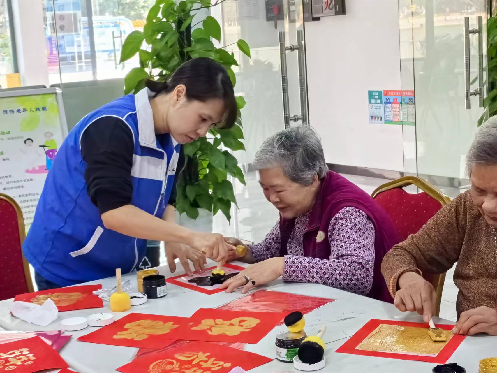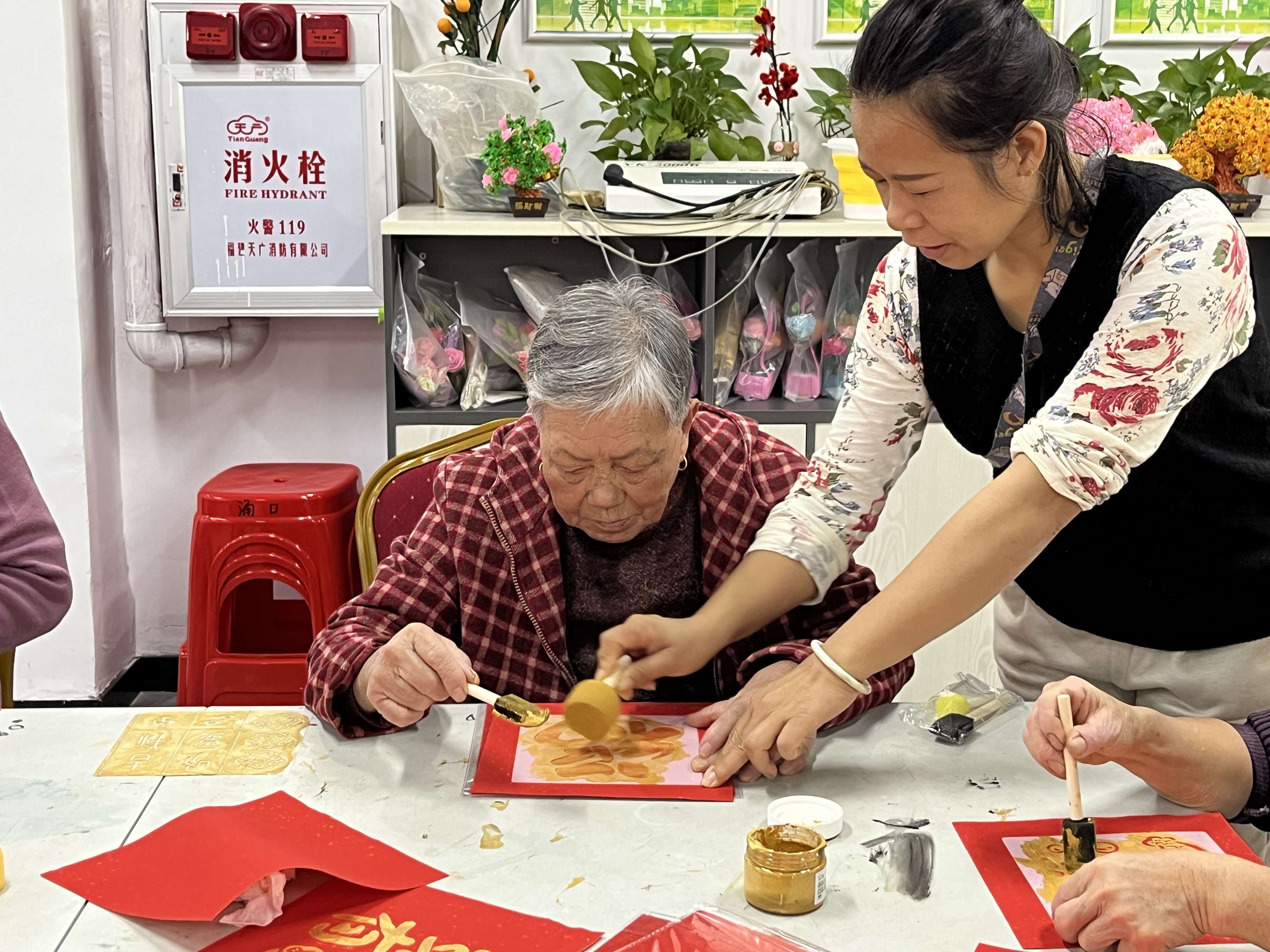 活动伊始,社工为到场的老年朋友们准备了齐全的新年拓印手工材料,包括红色宣纸、金色颜料、黑色颜料、镂空模版、海绵刷子等。在简要介绍活动目的和流程后,社工为大家详细演示了如何制作新年拓印,并鼓励大家发挥创意,用不同的颜料制作出独特的作品。