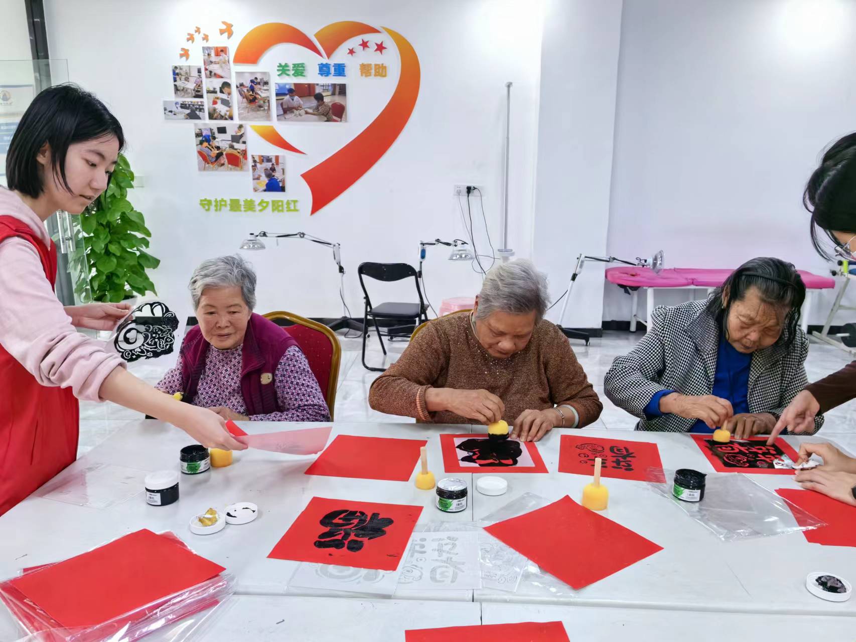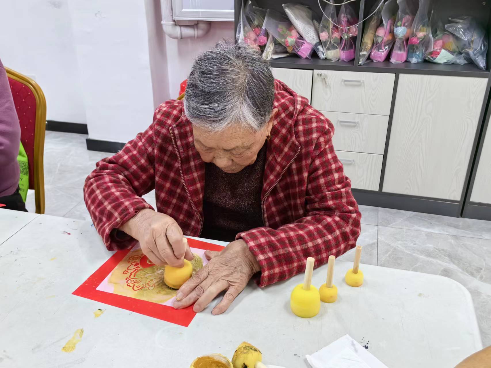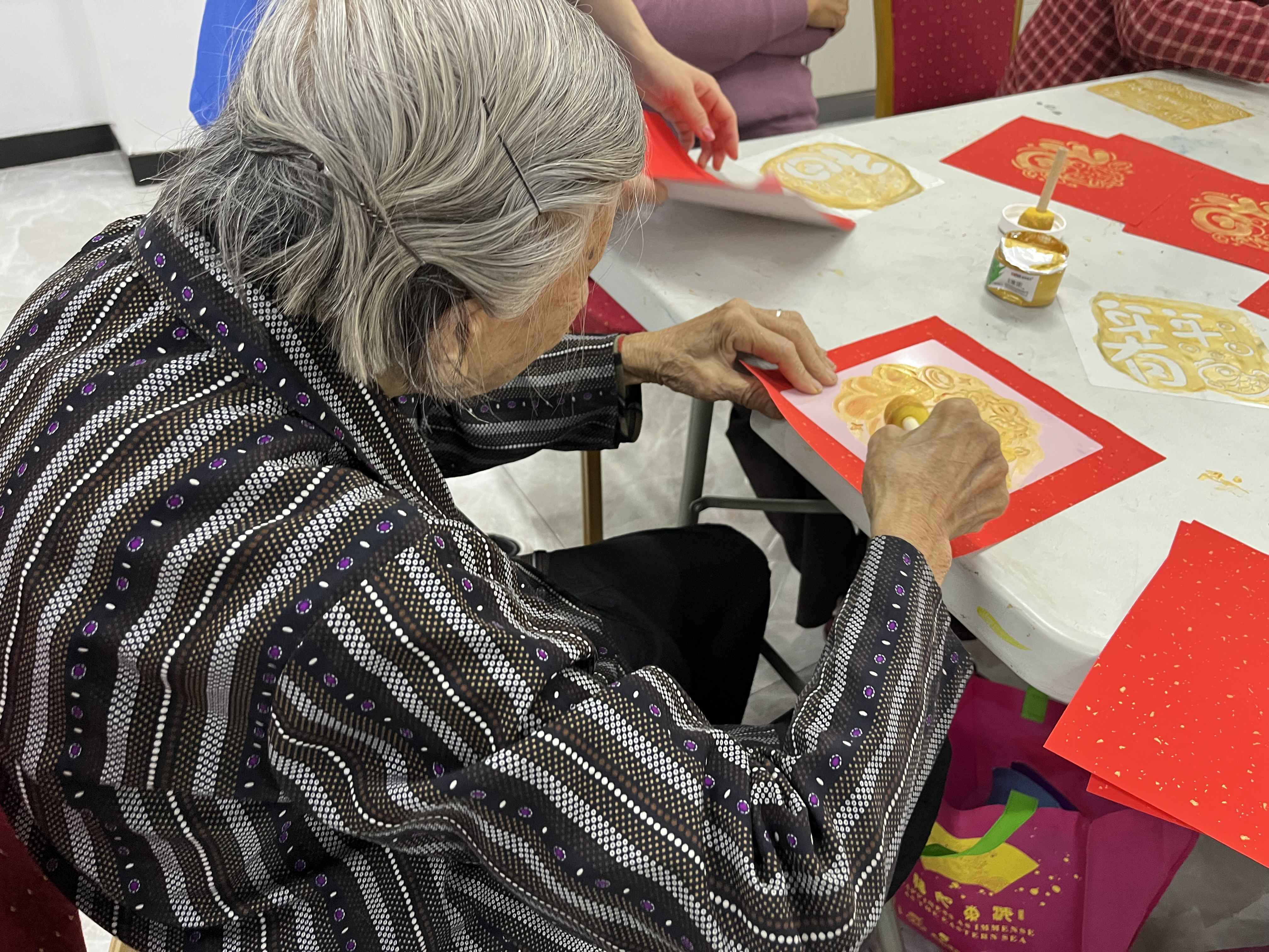 现场氛围温馨而热烈,老年朋友们或是互相交流制作心得,或是埋头苦干、精心制作。他们的脸上洋溢着欢乐和满足的笑容。此次手工虽然制作简单,老年人要把它印得好看,也是不容易的,在社工和志愿者的协助下,一幅幅各具特色的新年拓印陆续呈现在大家眼前。