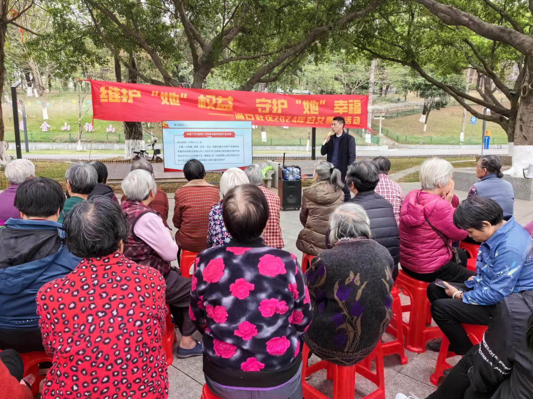 3月7日下午,为庆祝“三八”国际妇女节,一场精彩纷呈的妇女普法活动在涌口社区海月岩公园成功举行。本次活动由涌口社区及涌口社区综合服务中心联合举办,旨在通过讲座的形式,向广大妇女普及法律知识,提升她们的法治意识,为构建和谐社会贡献力量。