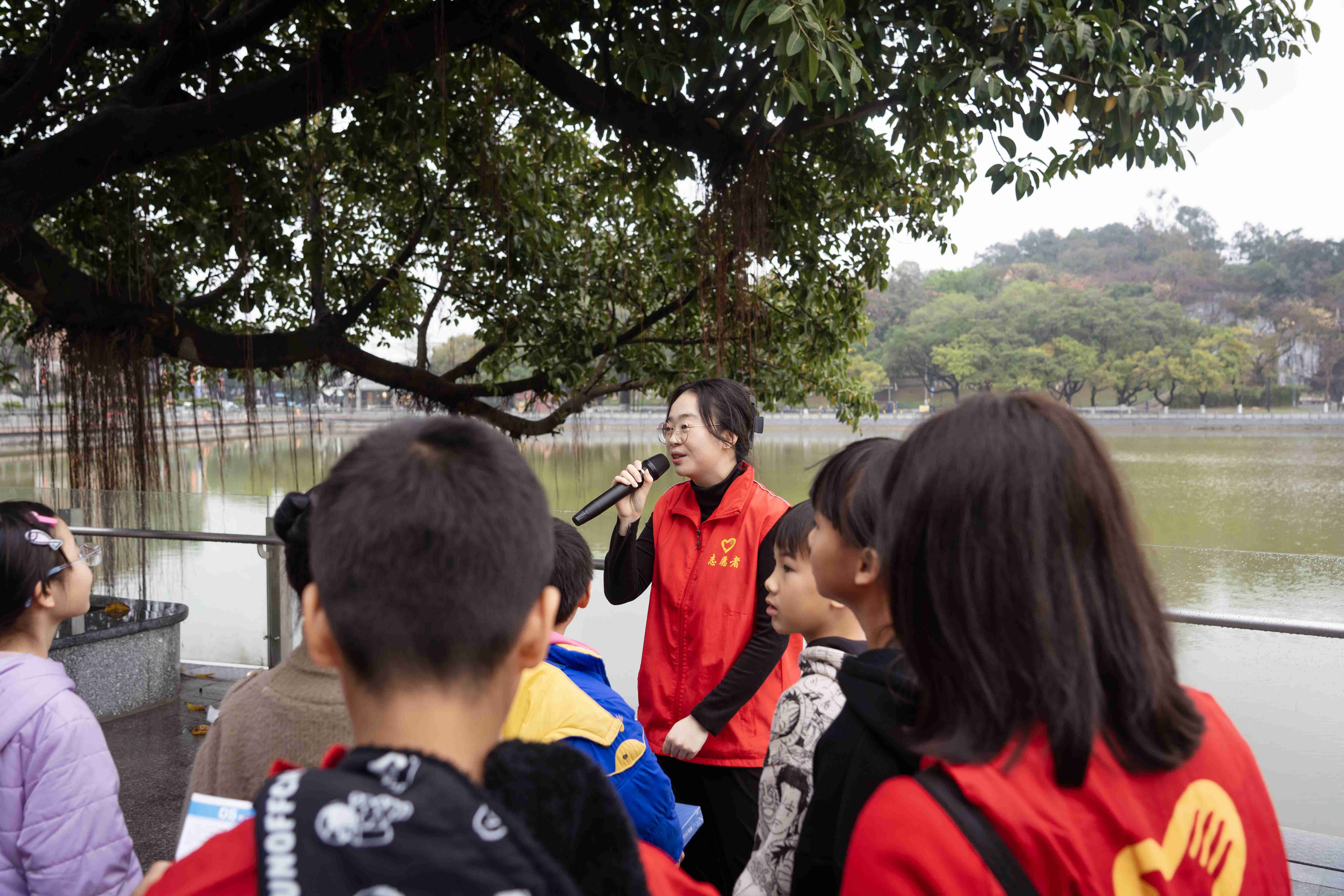 在市林科所技术人员的带领下,在场学生通过参观展板,了解植物分类方法,学习如何观察和识别植物。通过现场观察榕树的树干、根系、叶、果等,了解榕树的生理特征和辨认方法,感受植物独特的魅力。