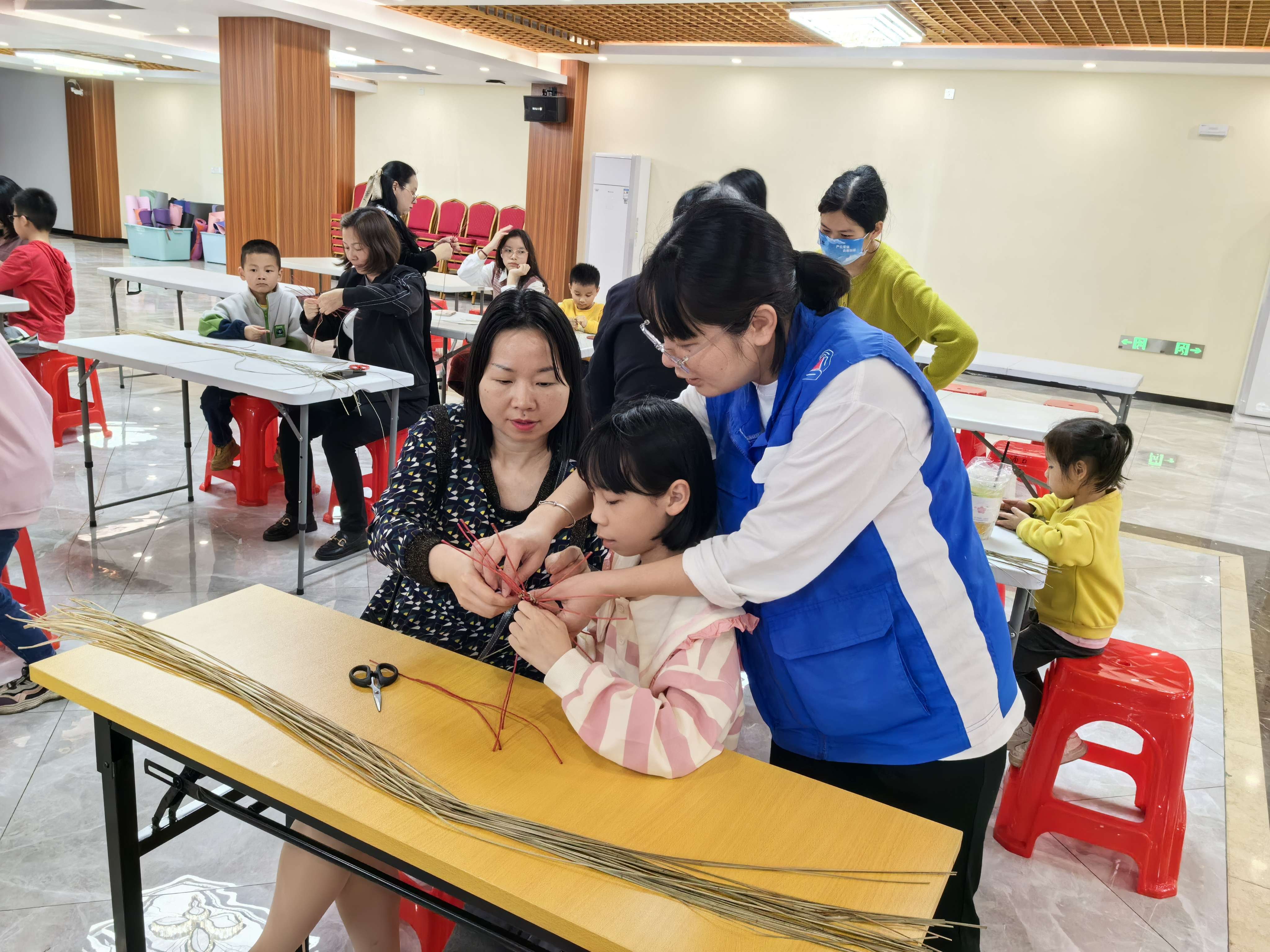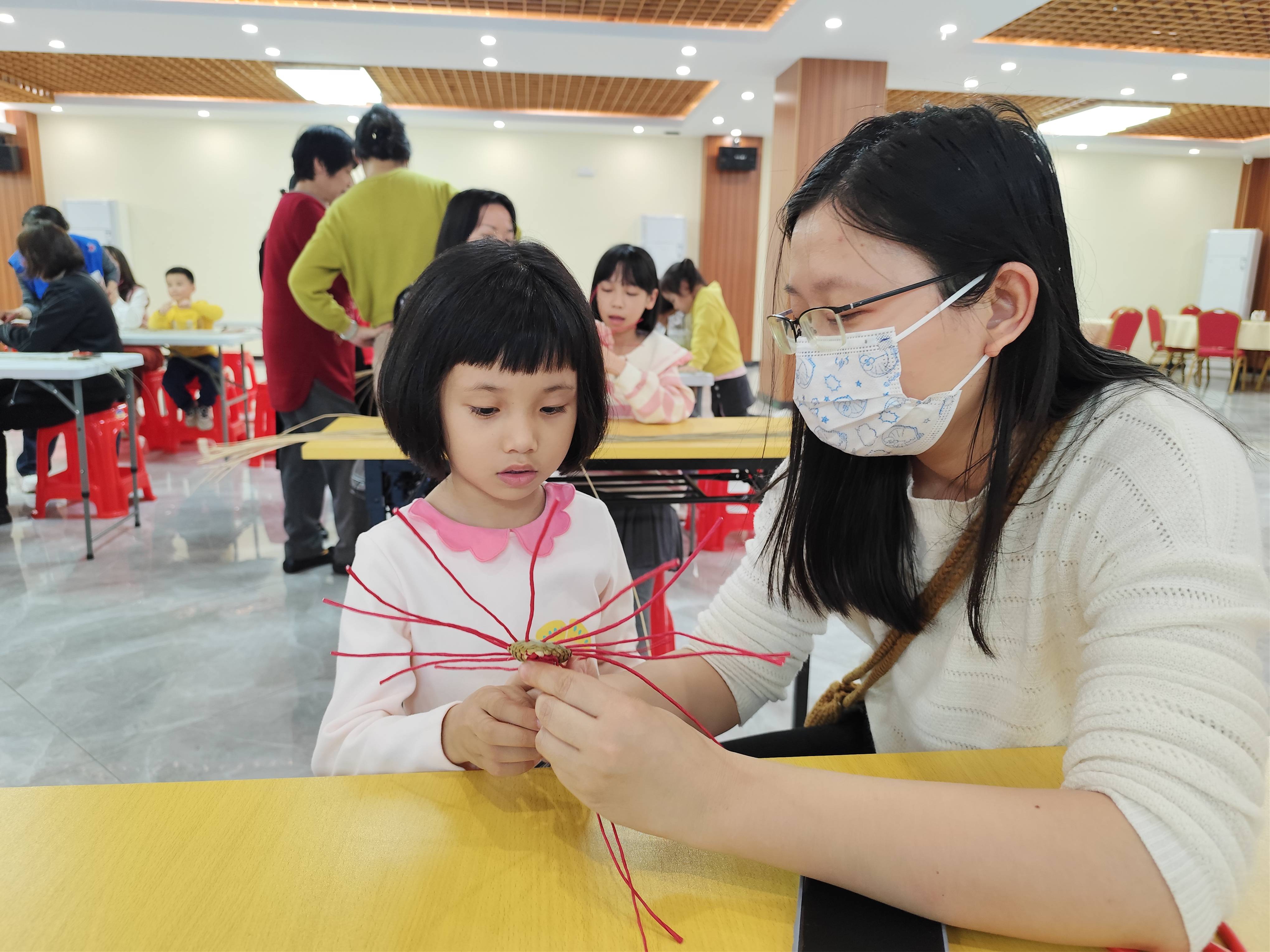 活动中,叶老师进行现场示范,展示莞草编织的基本技法和步骤,同时讲解编织过程中的注意事项和技巧要点。在老师的指导下,参与者们开始动手实践,利用提供的莞草和工具进行编织。在叶老师的带领下,在场小朋友和家长们,学习如何编织向日葵花朵以及书签,过程中,老师及时解答疑问,确保每位参与者都能掌握基本的编织技能。完成作品后,大家开心地展示着自己的作品,并与其他人交流编织心得和体验。