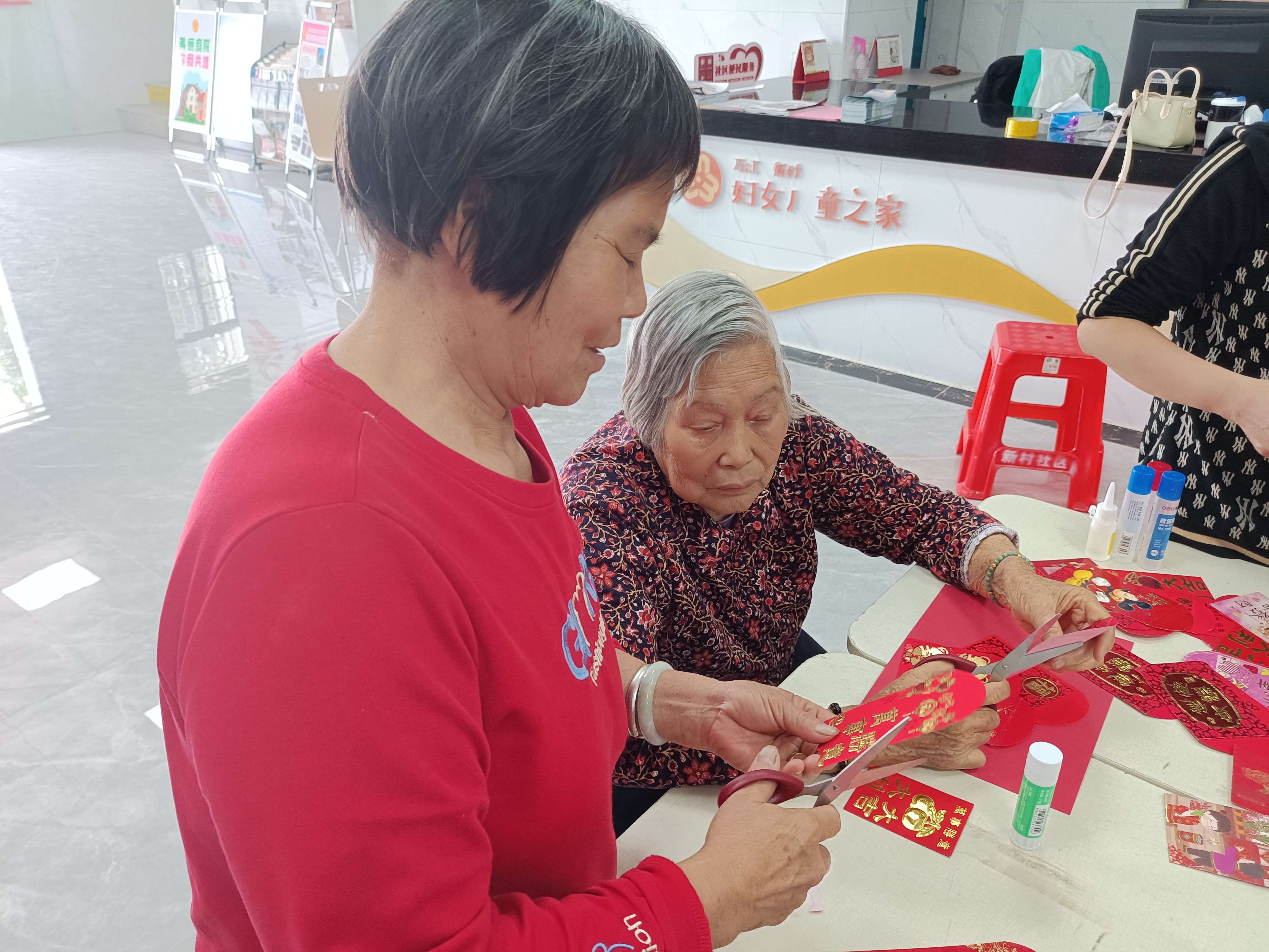 长者之间互相推荐认为好看的图案,互相帮忙裁剪,在寻找图案的同时互相诉说着祝福语。“今年龙年,我要贴一条龙贴上去!”“一帆风顺,这条船好看!”“大吉大利,这个够闪!”“这个福字够大,贴中间正合适!”