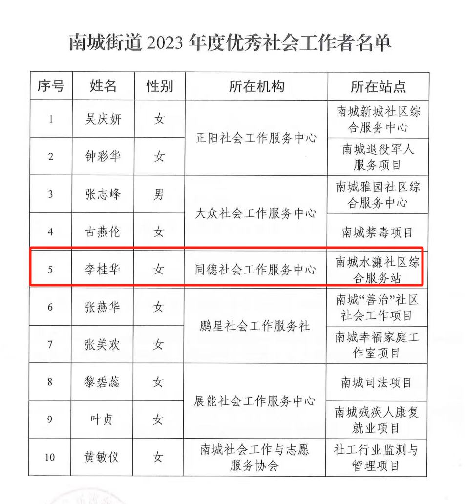 【东莞同德】同德社工李桂华荣获 “南城街道2023年度优秀社会工作者”称号
