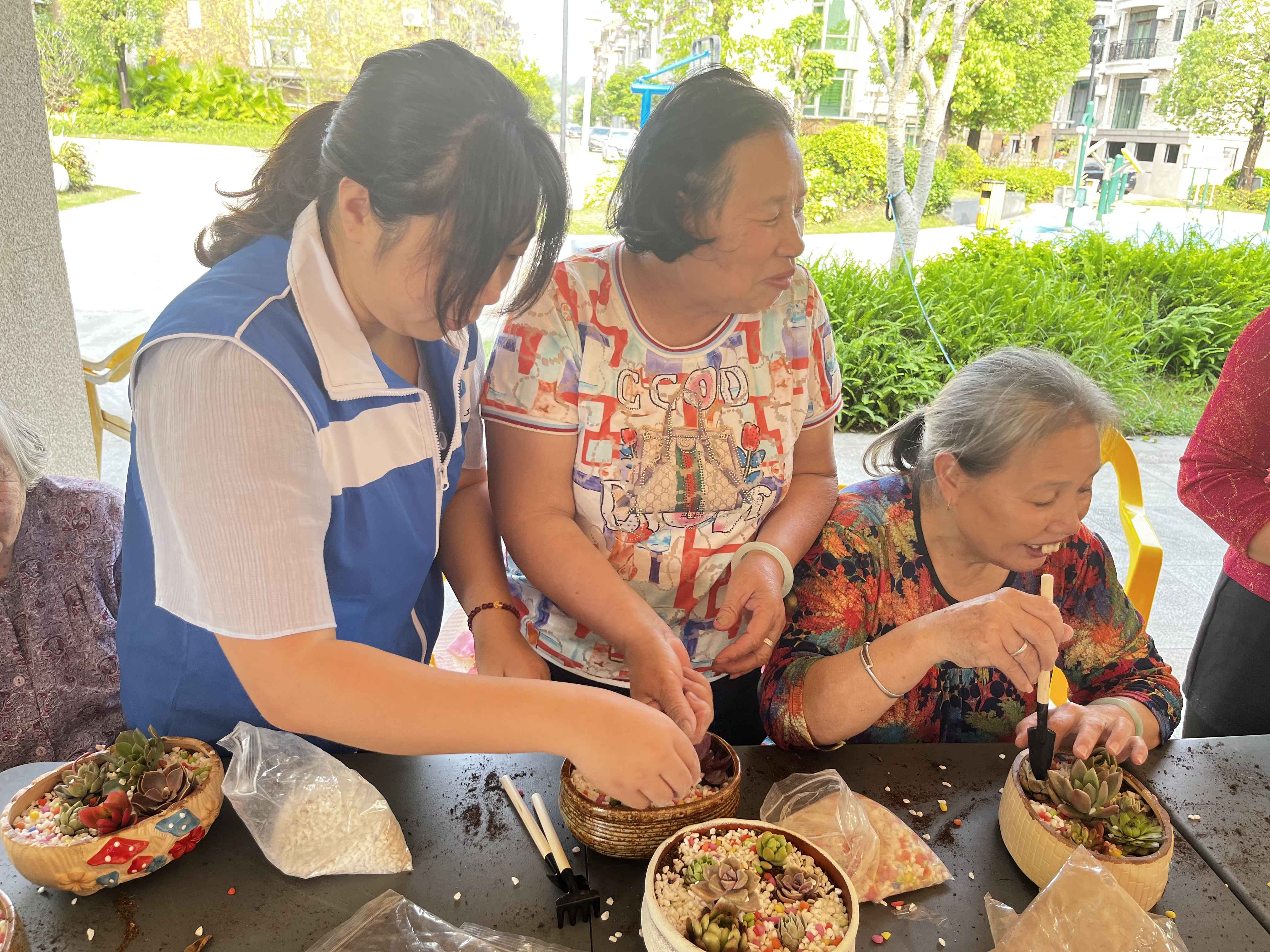 活动开始,社工首先长者们介绍种植的方法和步骤。介绍完毕后,长者们便迫不及待的开始动起手来……选取材料,填上陶粒、泥土、选取喜欢的多肉栽种、培土,再填上各色的小石子和装饰盆栽的小玩意,在社工的协助下,一盆盆造型各异的多肉盆栽便完成了。