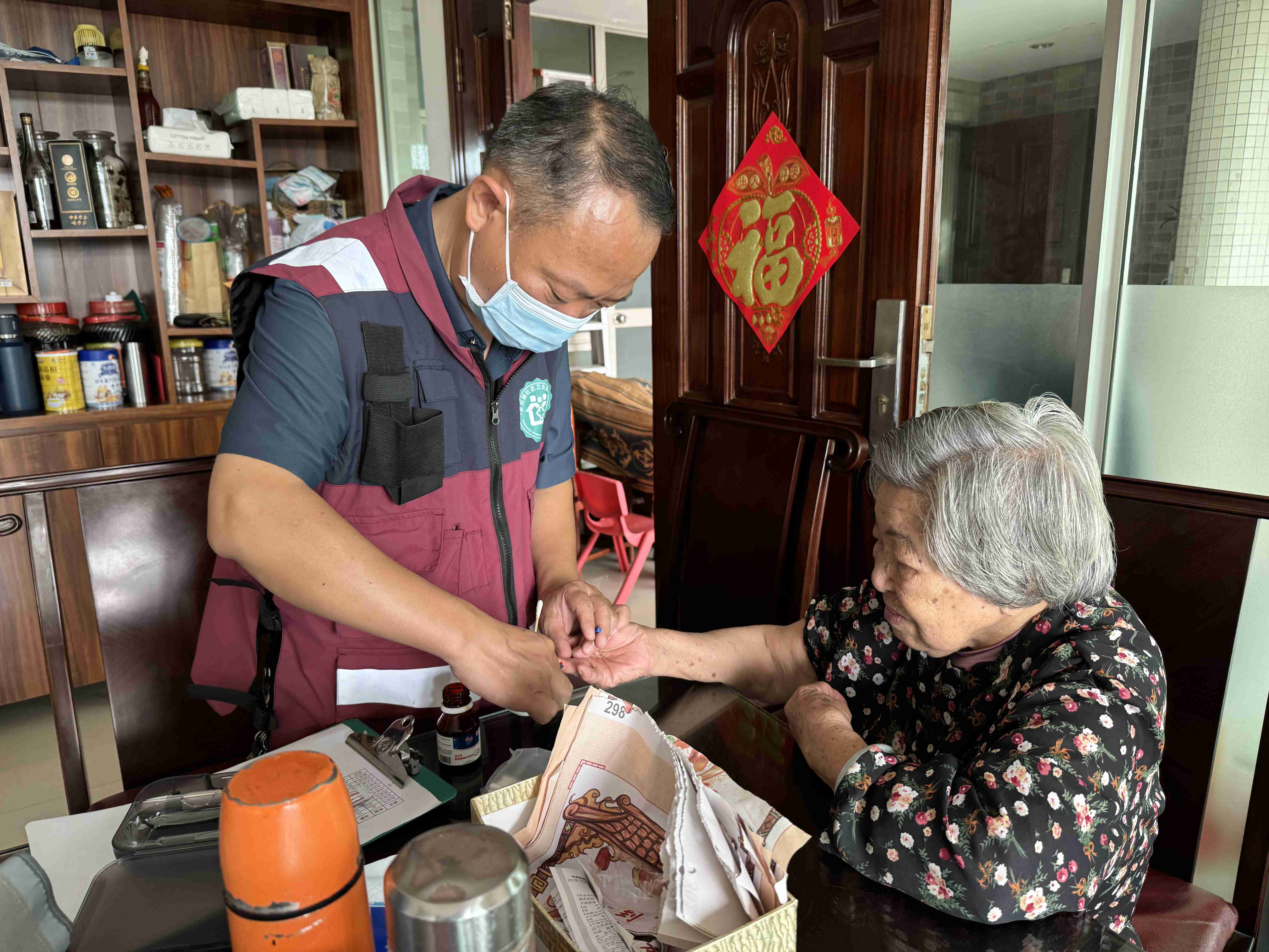 在活动过程中,社区医护人员为每位长者进行血压、血糖、体温测量并进行健康问题答疑。针对服务对象的身体情况和服药状况,提出健康饮食、健康生活习惯方面的建议。
