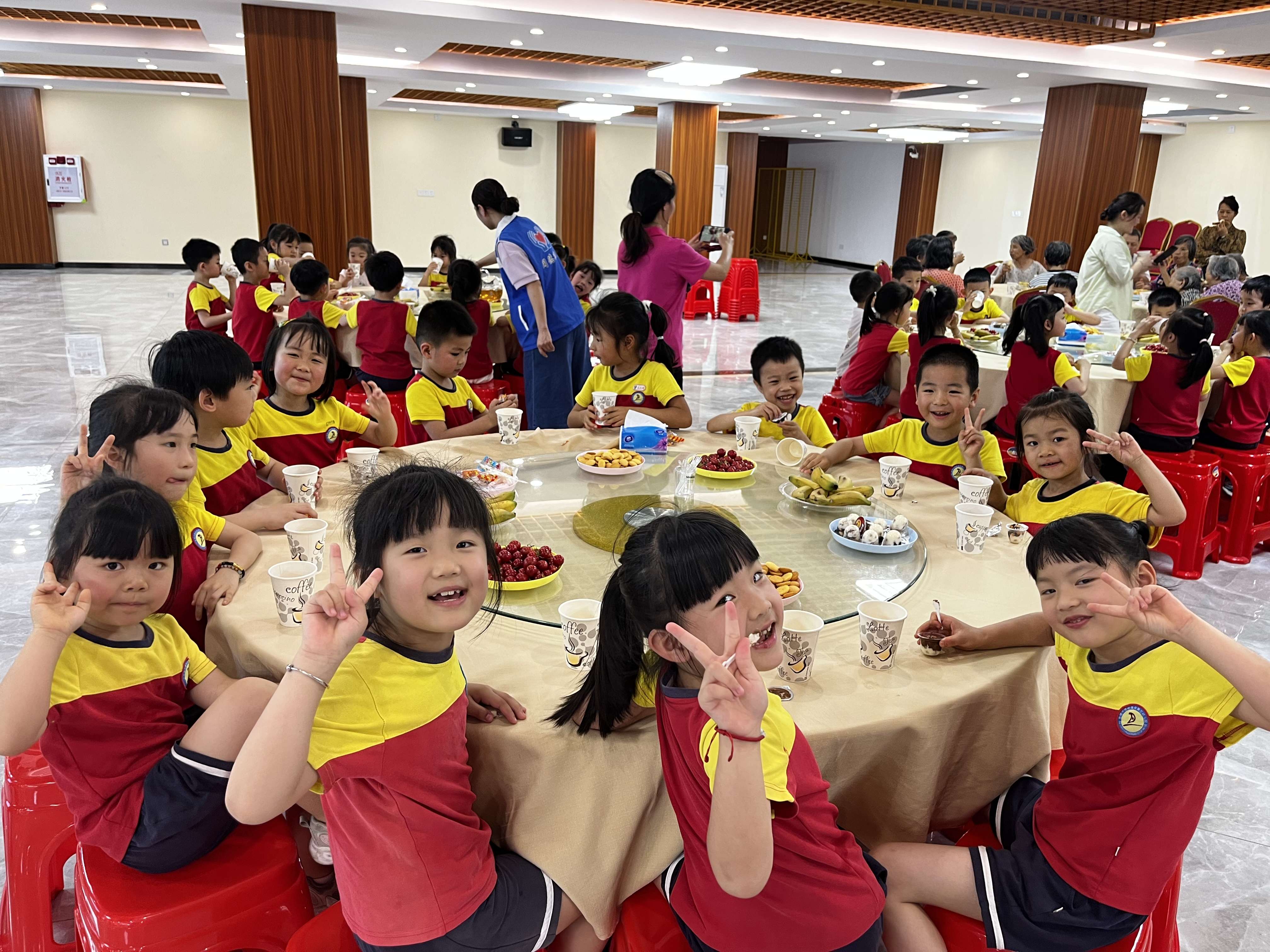 游戏过后,老人和孩子们徒步回到中心,一起享用美味的下午茶。大家在品尝美食的同时,观看中华传统美德故事,享受交流的乐趣。