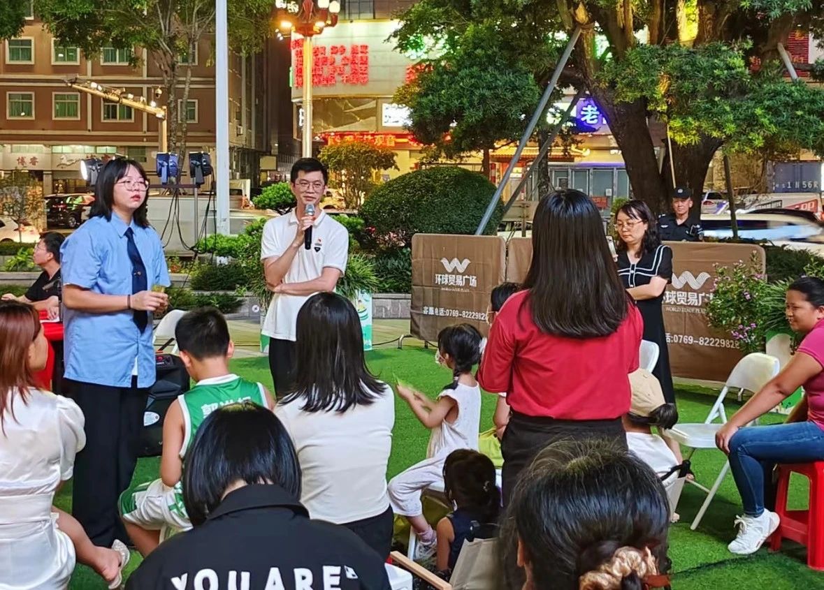 在大朗镇环球广场,卢泽豪还别出心裁地开展了模拟法庭“快闪活动”。他组织社区青少年排练模拟法庭,以“快闪”形式出现在社区商场,搭建起临时法庭,吸引路过的社区居民观看模拟法庭,活动结束后现场解答社区居民的法律问题。这种新颖的形式吸引了大量社区居民的关注,让他们在轻松愉快的氛围中学习法律知识。