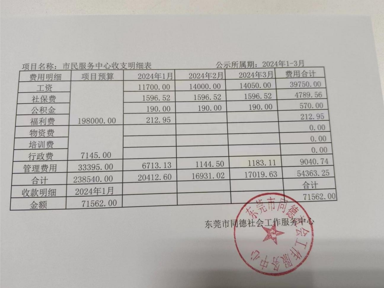 市民服务中心2024年1-3月资金使用情况公示
