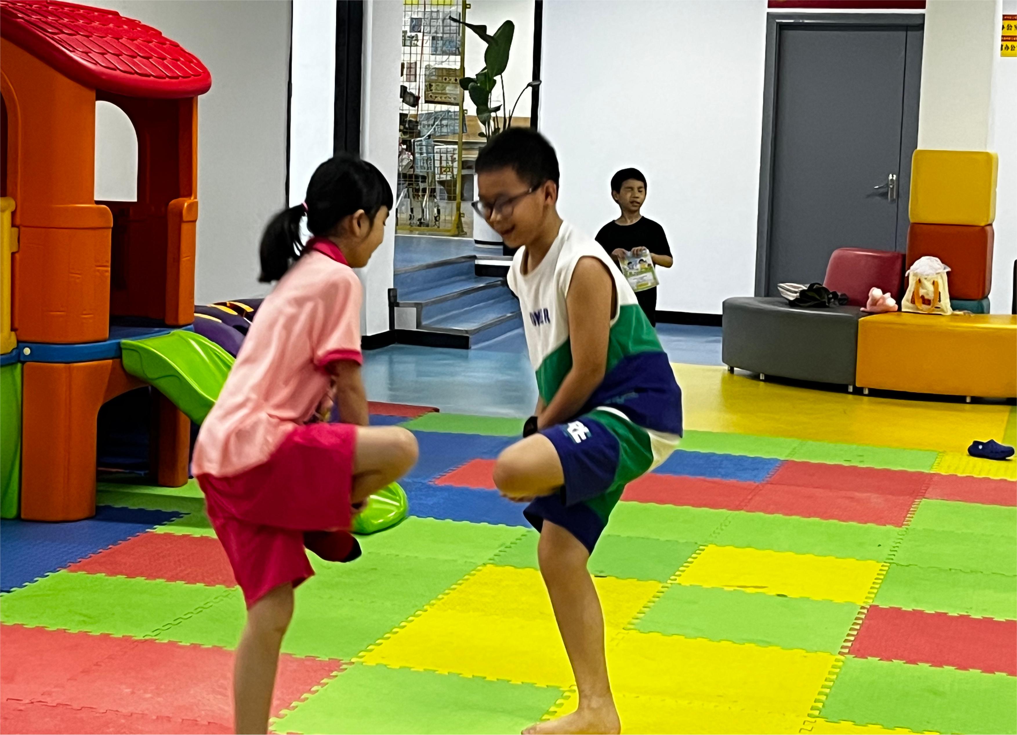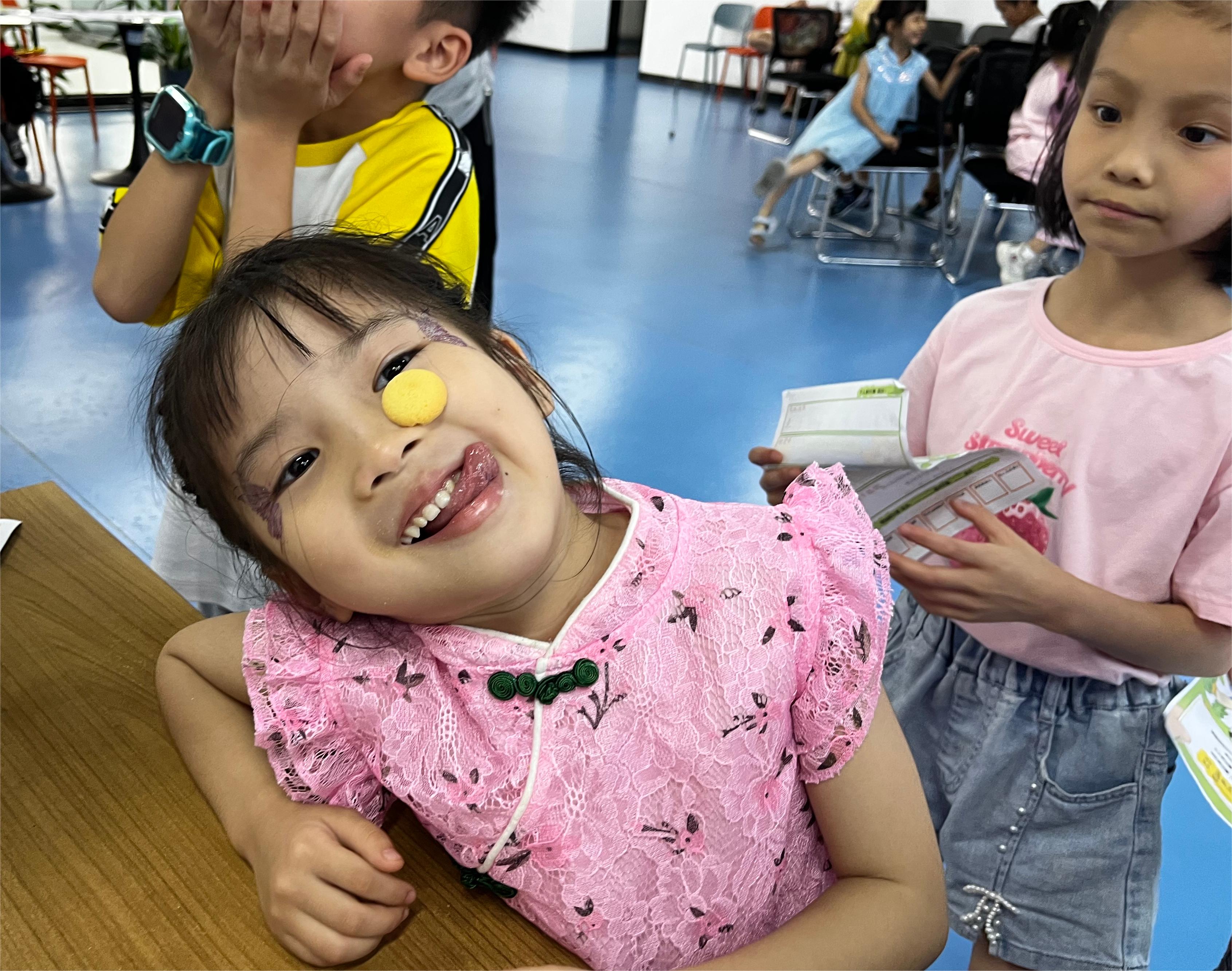 社工介绍游戏规则和注意事项后,游园会正式开始。孩子们穿梭于各个游戏摊位之间,脸上洋溢着灿烂的笑容。他们或争分夺秒地抢凳子,或斗智斗勇地斗鸡,或携手合作完成你拉我跳的任务,或巧妙地吃到额头上的饼干,又或是专注地进行颜色匹配挑战,在游戏中孩子们充分展现了自己的聪明才智和团队协作能力。