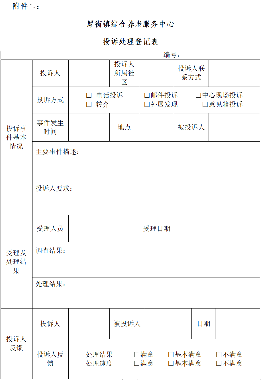 为提升厚街镇综合养老服务中心的服务意识、完善中心服务质量,特制定本机制,对中心服务的长者或其家属的投诉处理进行规范管理。