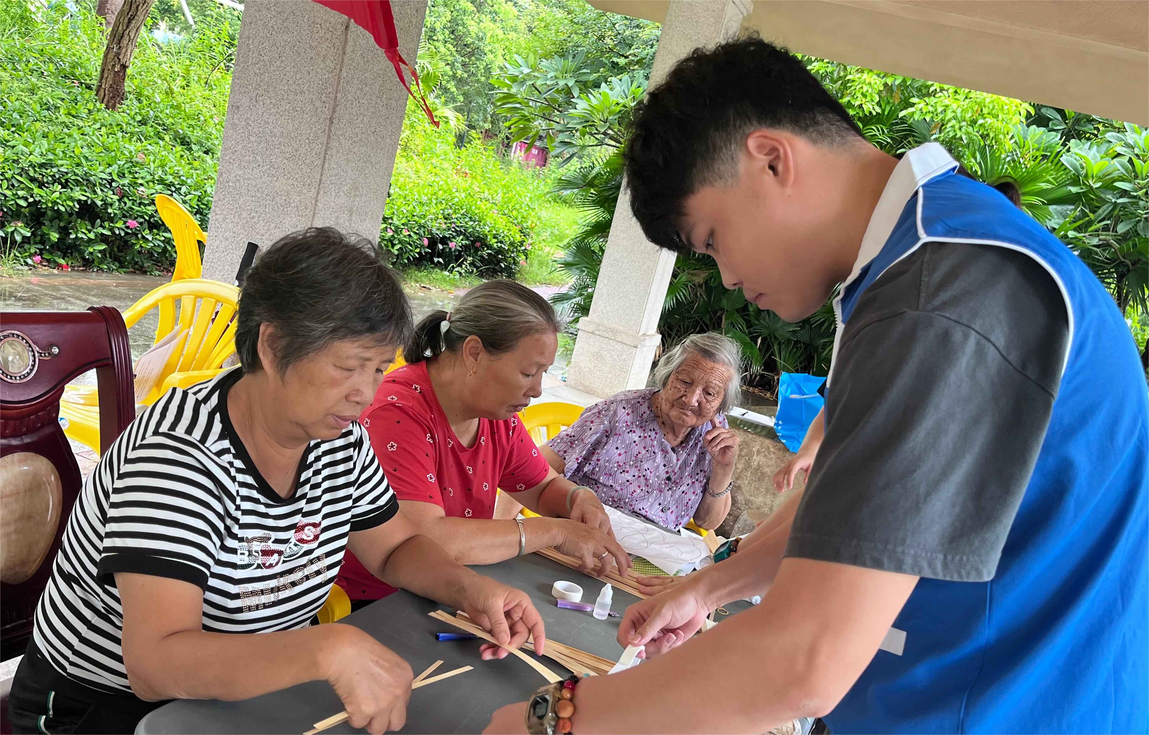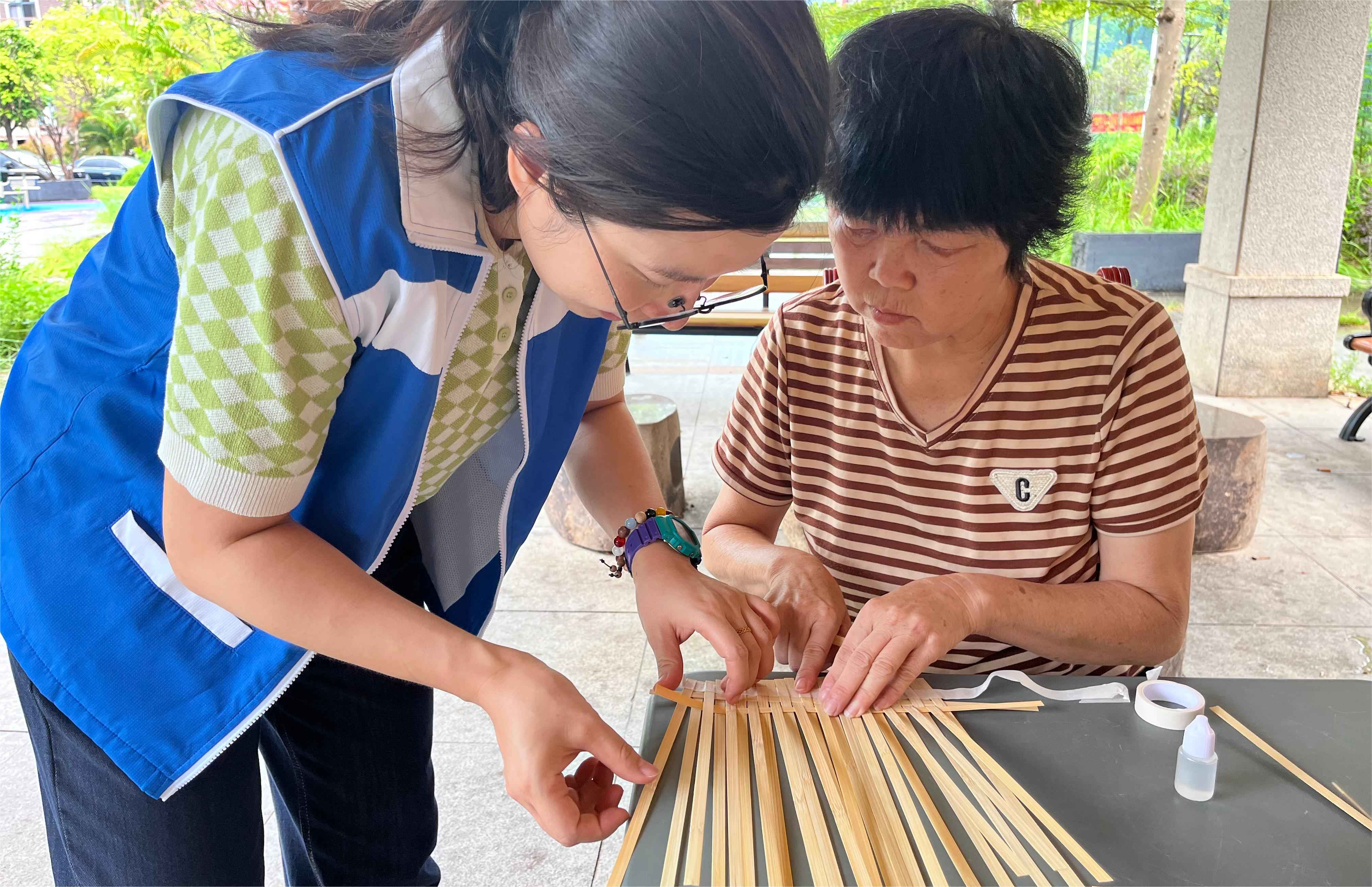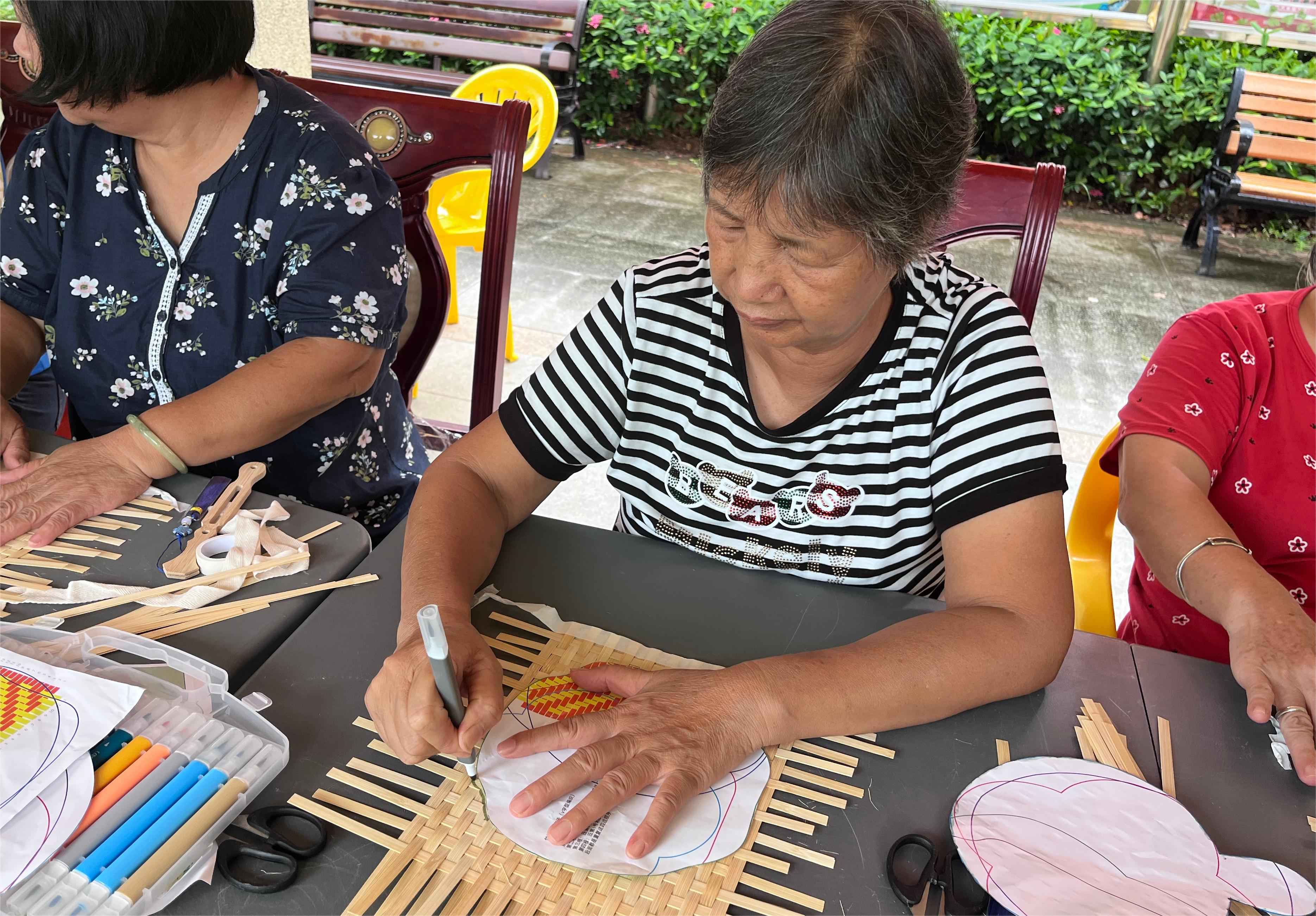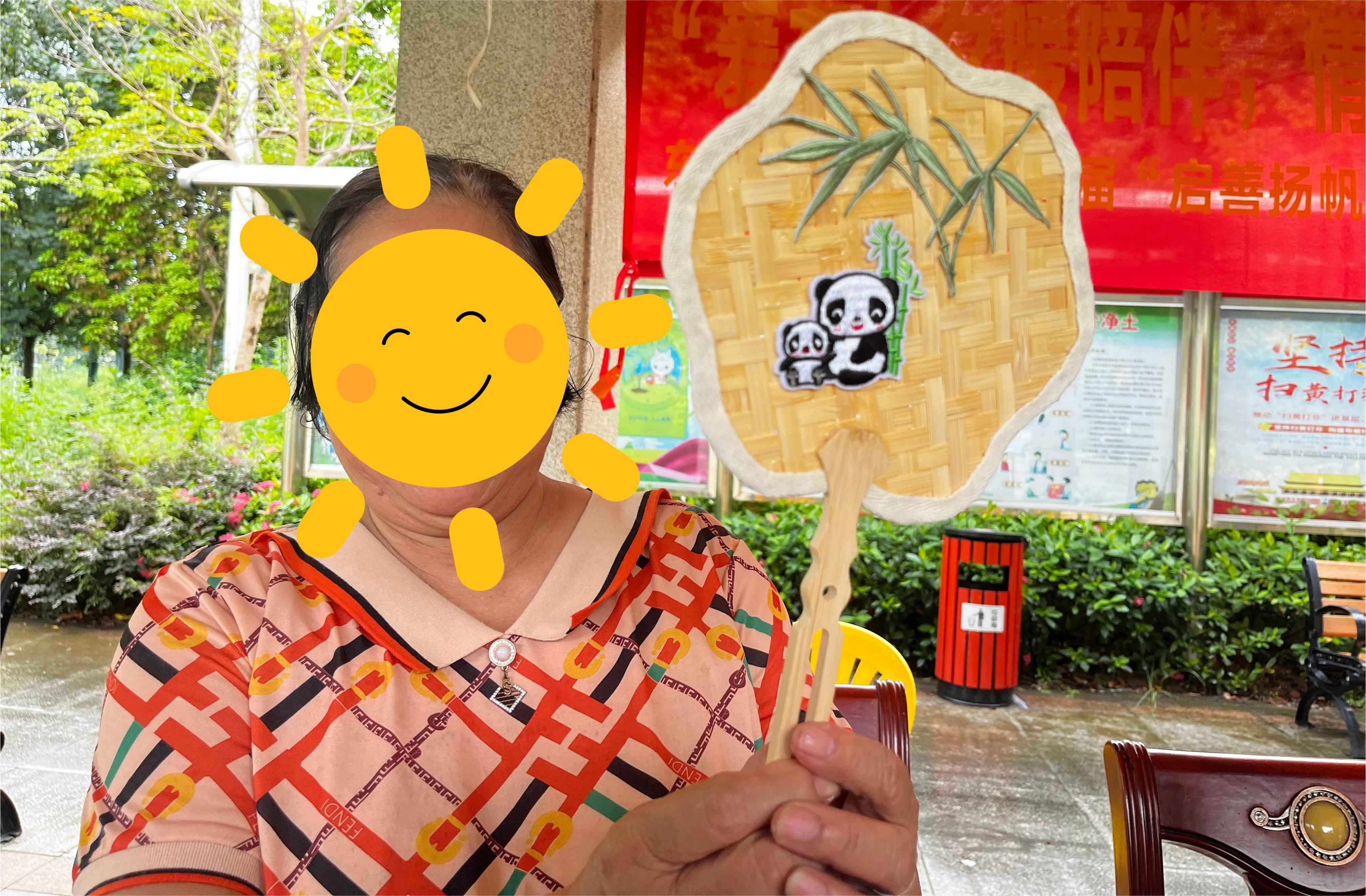 活动开始前天空下着小雨,但这并没有减少大家参加活动的热情。活动开始,社工向长者们介绍了竹编的历史文化以及竹编扇的制作方法。在对竹编工艺有了一定了解后,长者在社工的带领下开始了竹编扇的制作。活动中,长者们一边用心编制,一边说起年轻时的回忆,“以前家里有很多竹制品,竹席、扫把……现在年轻人都很少见到这些东西了。”在长者们一编一挑之间,竹编扇初具雏形。最后,大家将扇子裁剪修形后把边缘包边,装上扇柄,贴上布贴,一把把形态各异的扇子灵动地呈现眼前。