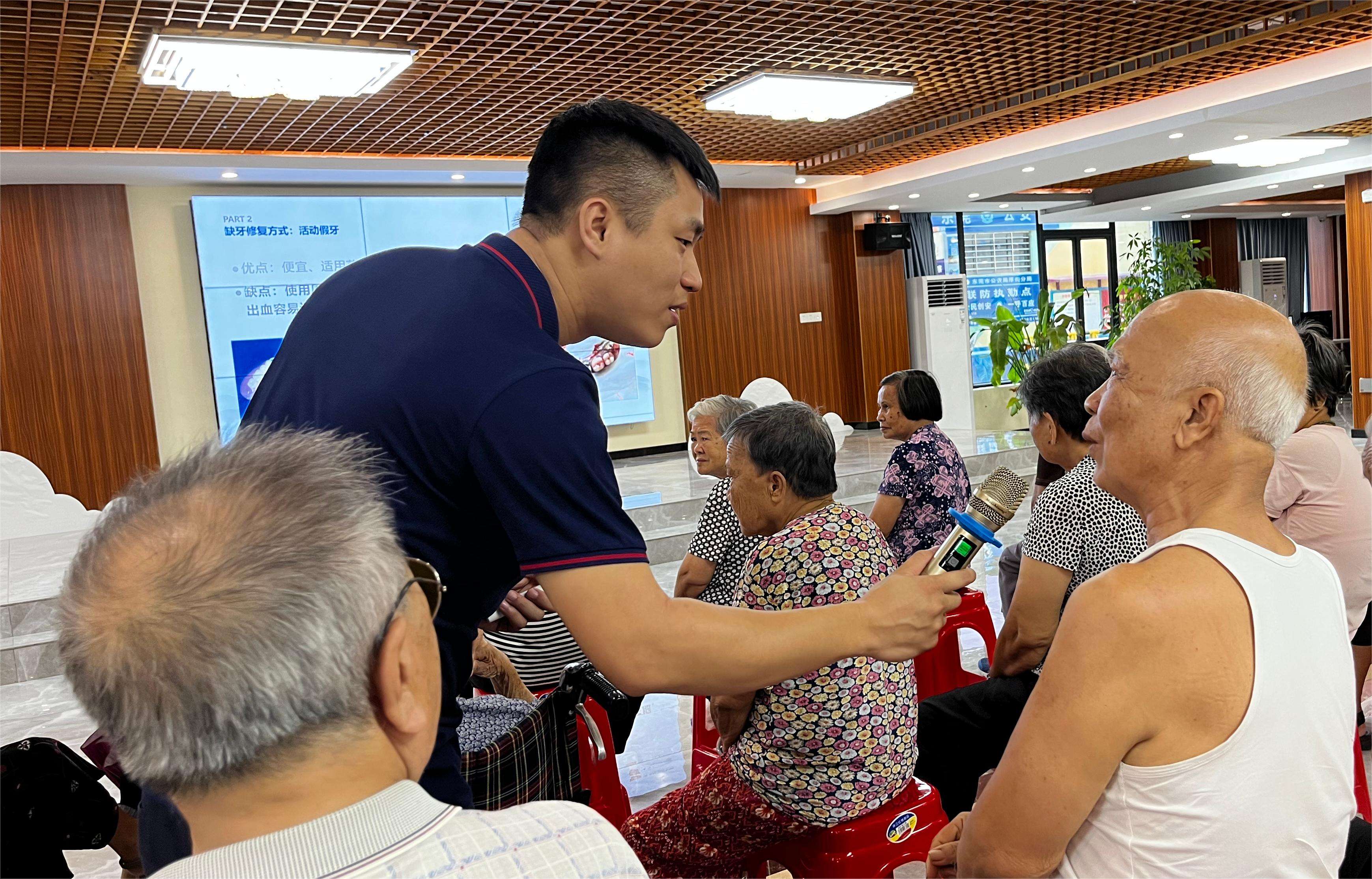 活动现场,座无虚席,众多老年人怀着对口腔健康知识的期待早早来到了会场。首先,经验丰富的讲解员叶医生为大家讲述了口腔健康对于老年人生活的重要意义,强调了保持良好口腔状况对于整体健康的积极影响。紧接着,他又逐一列举了老年人口腔常见的问题,如牙齿松动、牙龈萎缩、龋齿等,让大家对这些问题有了更清晰的认识。在谈到如何进行日常维护时,叶医生更是细致入微,从正确的刷牙方式、饮食注意事项,到定期的口腔检查,每一个环节都讲解得明明白白。他还生动地引用了“小洞不补,大洞吃苦;牙口不好,肠胃累倒”这样通俗易懂的俗语,让老人们更深刻地理解了及时处理口腔问题的重要性。