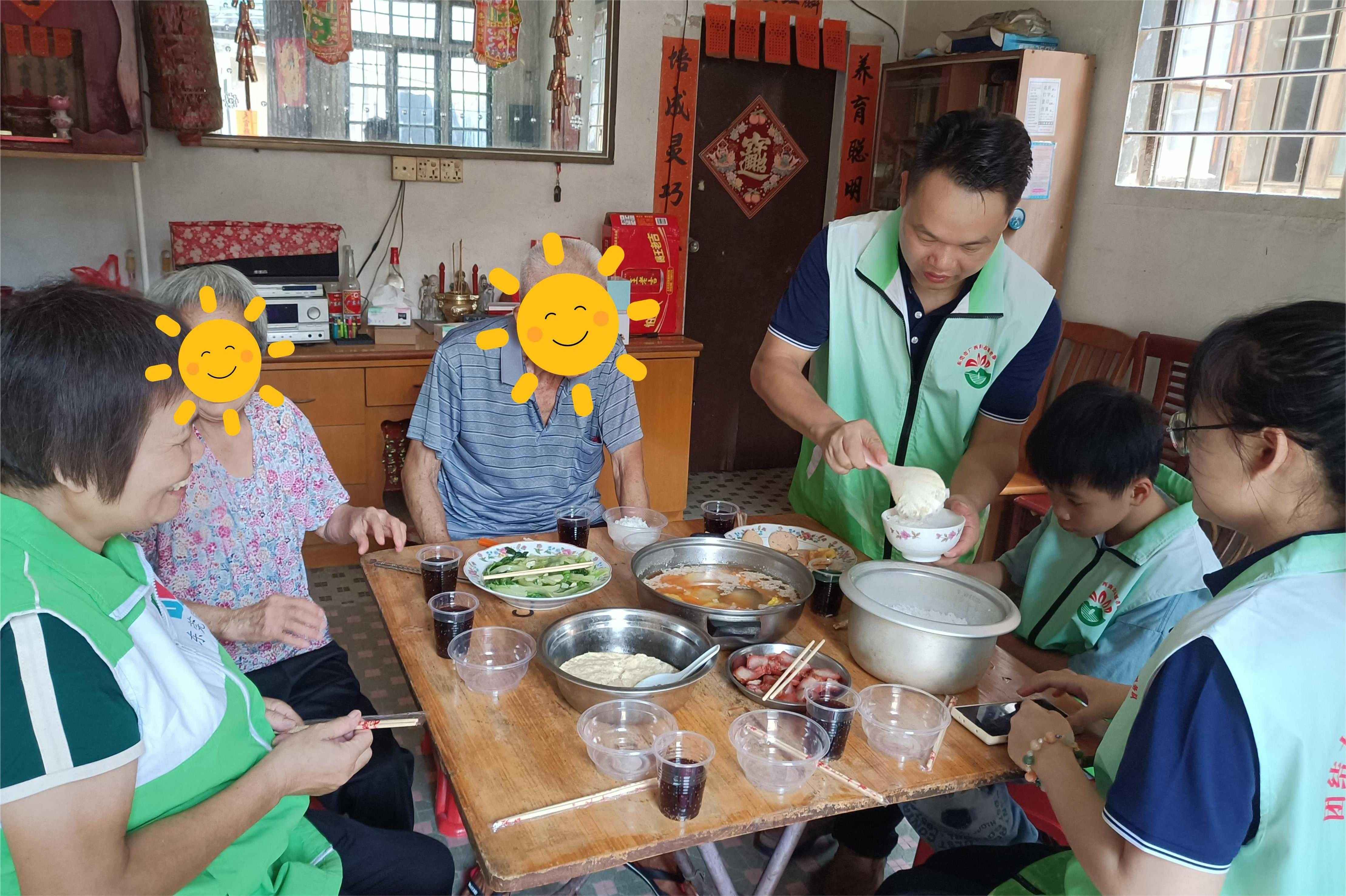 来到长者家中,各关爱服务小组成员马上按照分工各自就位。厨房里,部分成员有的洗菜切菜,有的生火煮饭,有的掌勺烹饪。大家忙得不亦乐乎,汗水湿透了衣衫,但脸上始终洋溢着幸福的笑容。厨房外,另一部分成员帮长者打扫卫生,认真擦拭家具,整理物品,尽自己最大的努力让长者的居家环境变得舒适整洁。而我们小小志愿者成员则肩负着营造快乐因子的责任,他们充分运用各种游戏道具与长者们精彩互动,使得现场充满欢声笑语,长者脸上一直挂着幸福的笑容。经过1个小时的努力,一道道色香味俱佳的菜肴陆续出锅。关爱服务小组成员贴心地扶着长者到饭桌前坐下,为其盛汤勺饭,大家其乐融融地享受着美食,开心地交流着生活趣事,现场画面让人感到温馨又幸福。