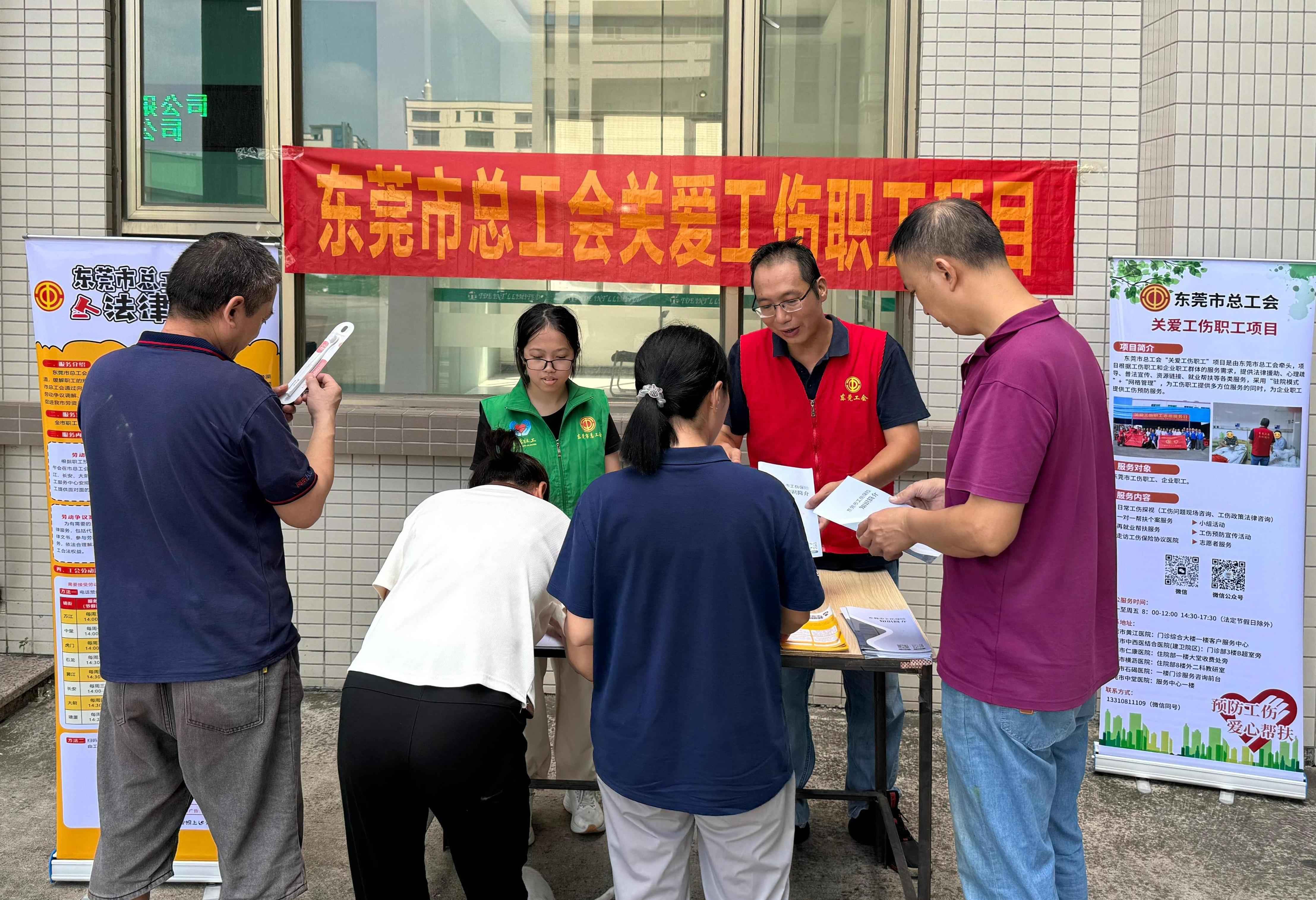 为进一步普及安全生产知识,提高广大职工的安全意识,预防工伤事故的发生,促进企业安全生产,东莞市总工会关爱工伤职工项目社工于2024年8月9日上午,在企石镇铁炉坑村工业园开展了“时时注意安全 处处预防事故”工伤预防宣传活动。