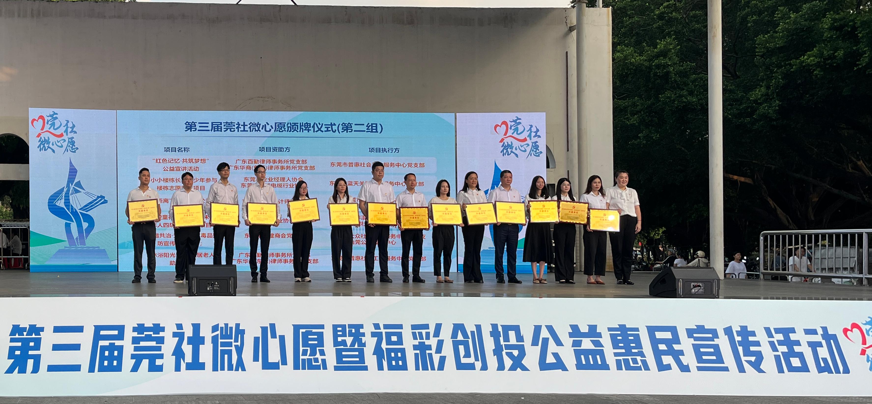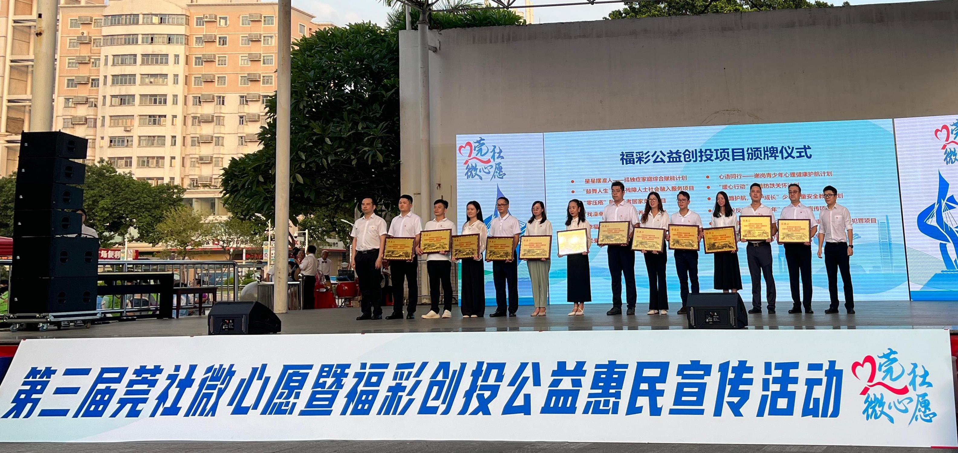 为深入学习贯彻党的二十大和二十届二中、三中全会精神,学习习近平总书记关于大力发展公益慈善事业的重要指示精神,践行以人民为中心的责任担当,坚持党建引领社会组织、爱心企业等社会力量积极支持和参与民政工作和公益慈善事业,2024年9月26日下午,东莞市社会组织委员会于东莞市人民公园东门广场举行了第三届“莞社微心愿”暨福彩公益创投惠民宣传活动!我机构两个项目入选并受邀参加摊位宣传活动。