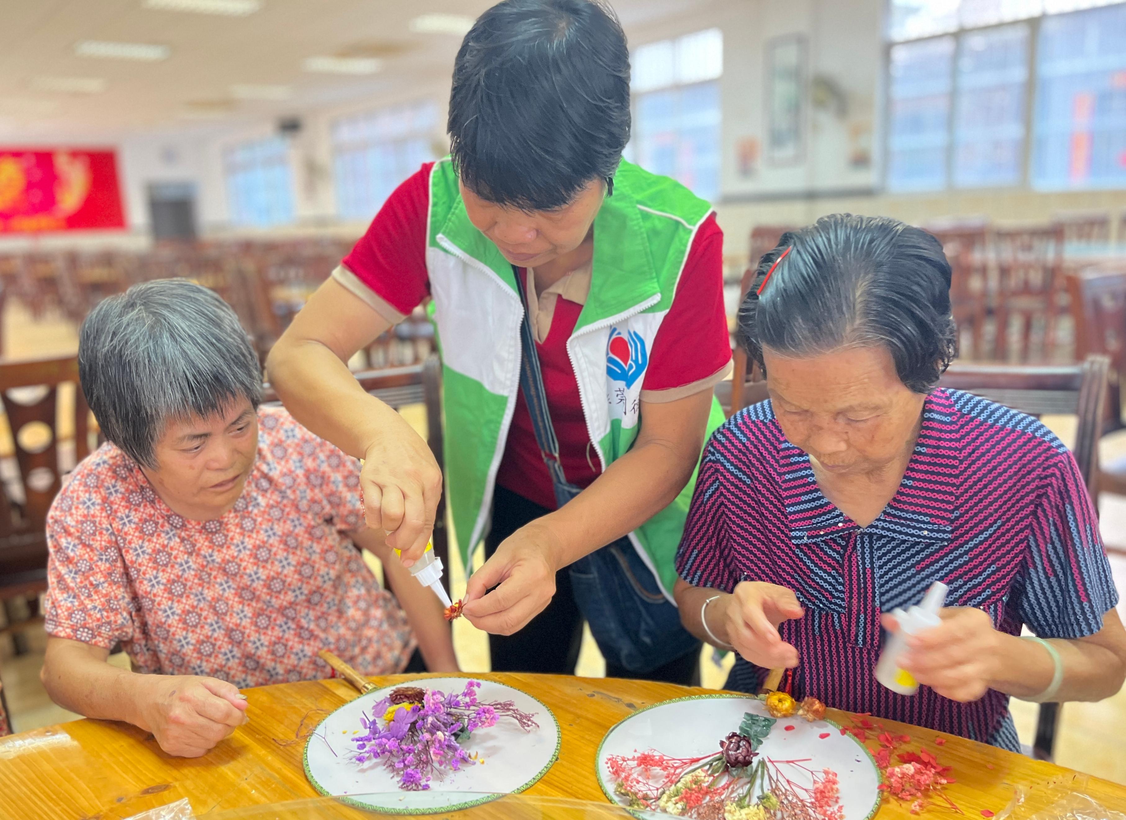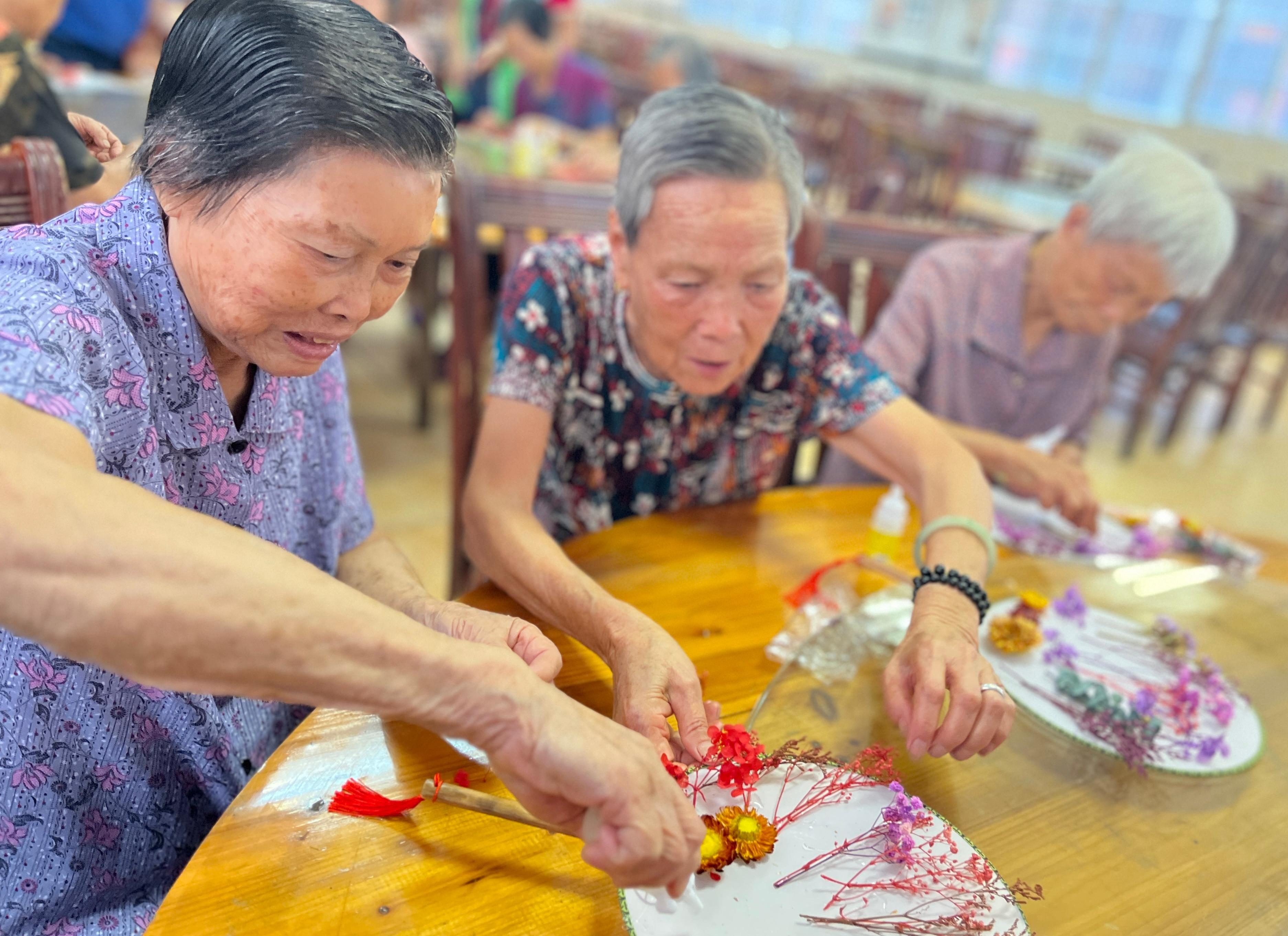 长者们根据各自的心意将各种漂亮的干花平铺在扇面上,再用胶水将它们黏贴在团扇上。大家在有限的空间发挥创意,原本素白的扇面渐渐被点缀。最后一把把独特的、有创意的干花扇在长者们手中诞生,他们的脸上洋溢着自豪和满足的笑容。
