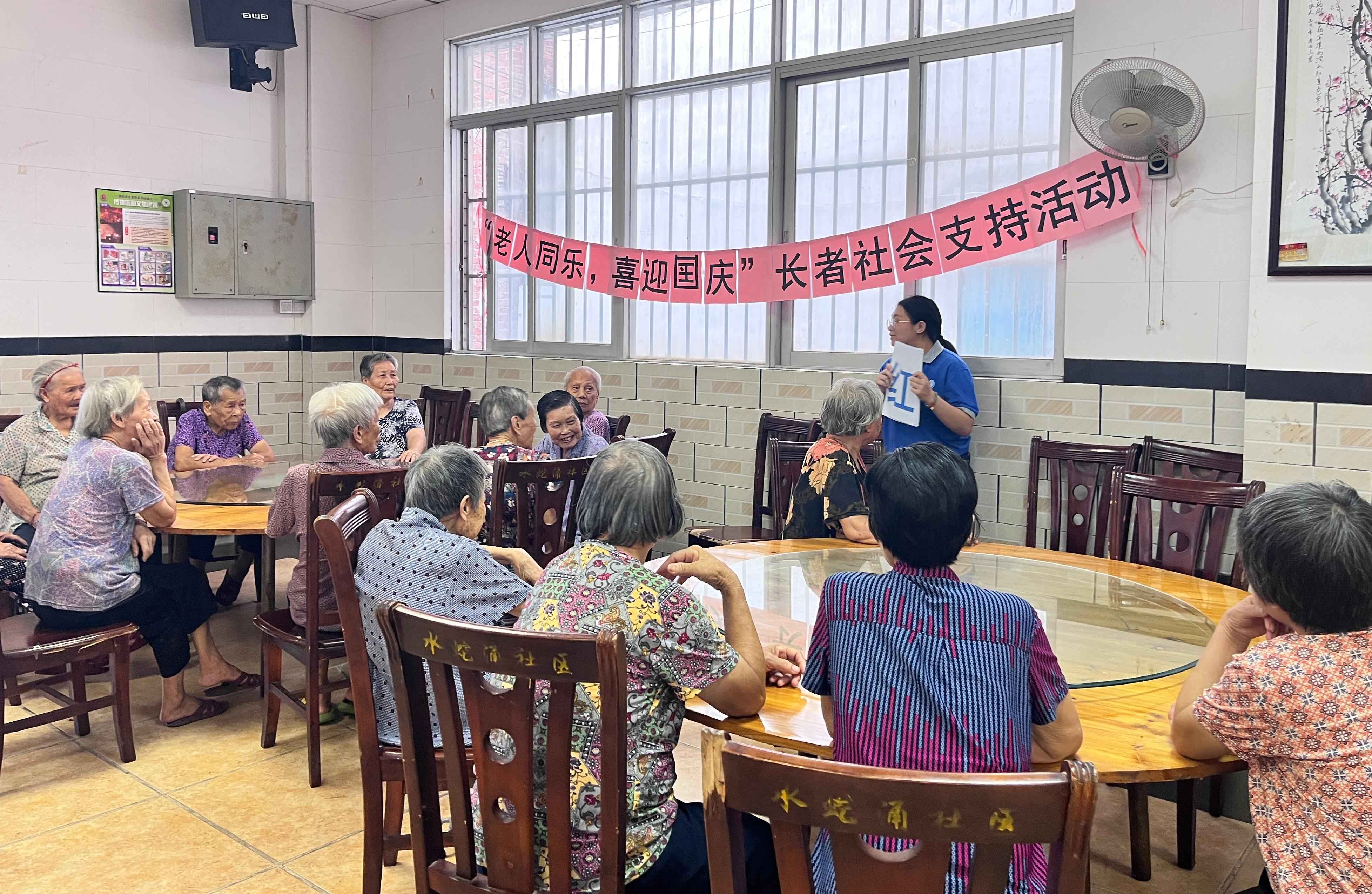 秋风送爽,在国庆佳节来临之际,为丰富水蛇涌社区长者的生活,增进长者之间的交流与互动,2024年9月27日,同德驻万江居家养老项目社工在水蛇涌社区开展“老人同乐,喜迎国庆”长者社会支持活动。
