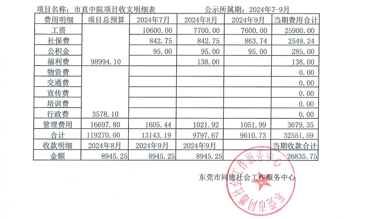 【东莞同德】市直中院岗位项目2024年7-9月收支明细表公示