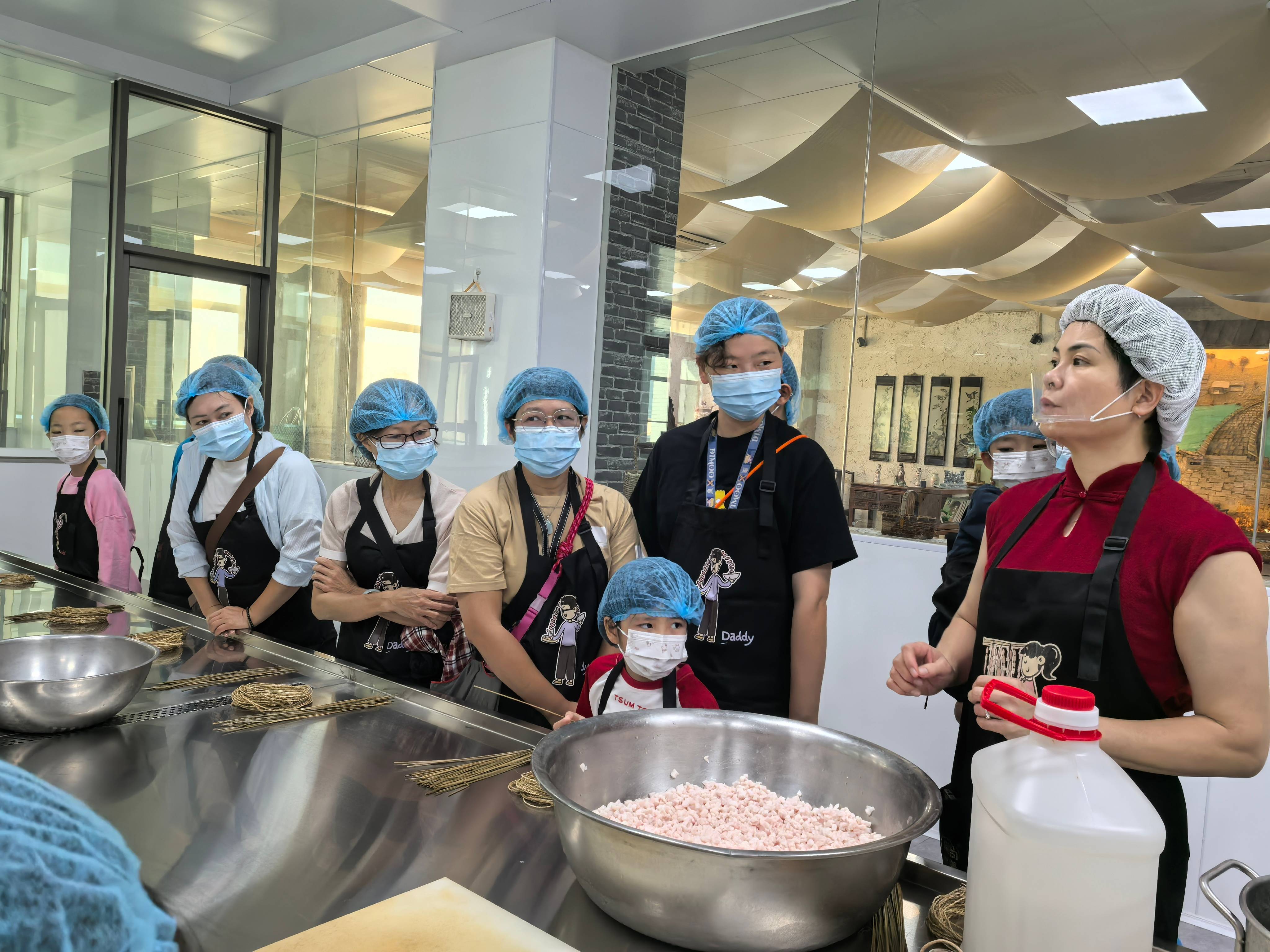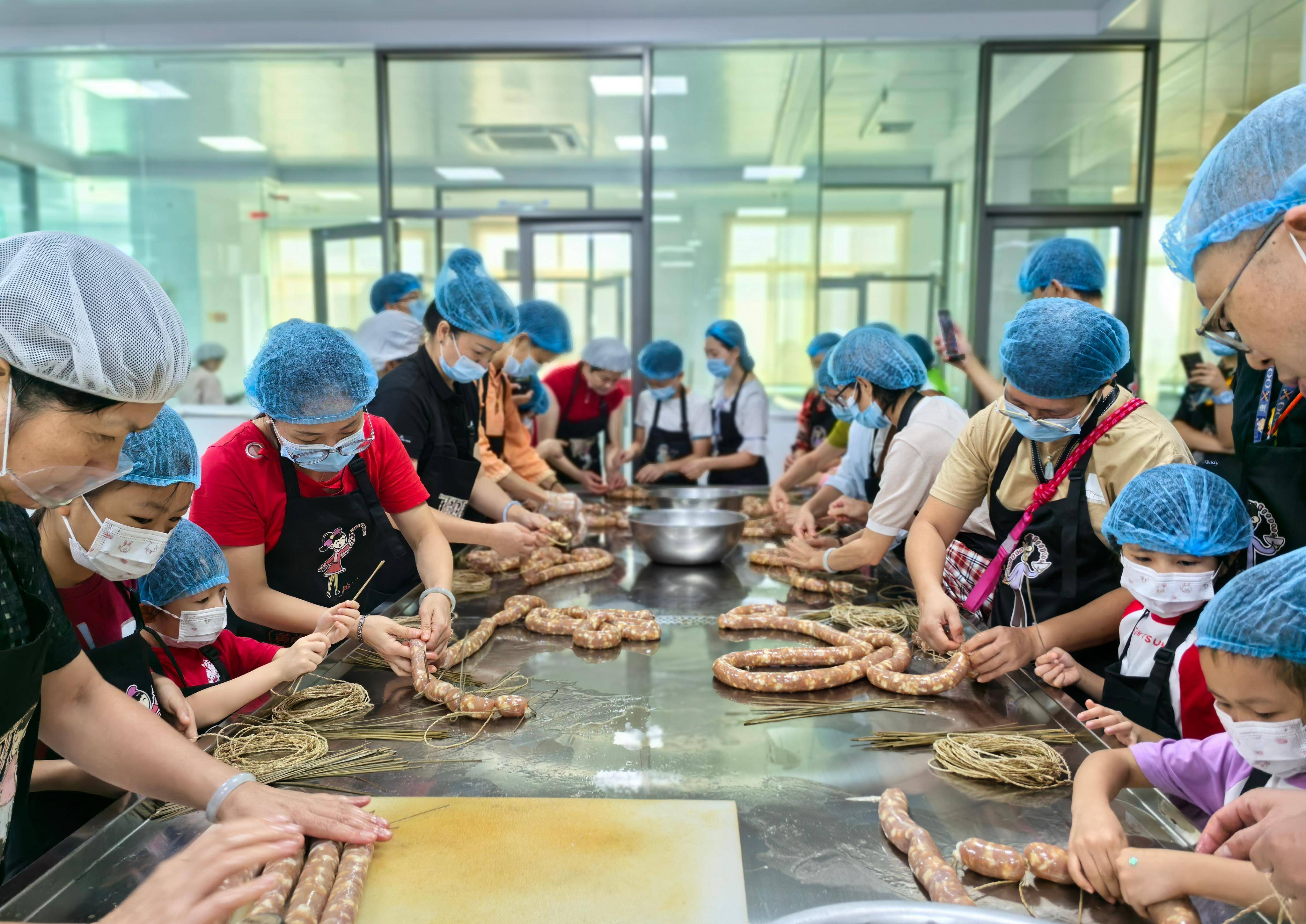 活动开始,居民们在黄弟腊味讲解员的带领下开启了腊味之旅。大家透过玻璃窗可以看见整洁、卫生的生产车间,工人们穿戴着整洁的工作服,戴着帽子和口罩。前来体验的居民们也纷纷穿戴好装备,洗手消毒,为进入生产车间做准备。待进入车间,讲解员为大家介绍如何选料以及腊肠的制作过程,居民们边听边观察制作步骤,迫不及待想体验一番。随后,在专业腊味师傅的指导下,居民们小心地操作着机器,感受腊肠是如何成型。从灌肠、打孔、绑节到晾晒,大家沉浸式地体验着手作的乐趣,不仅很好地认识了东莞的特色产业和传统技艺,更认识到这些美味佳肴背后的辛勤付出与岁月沉淀。