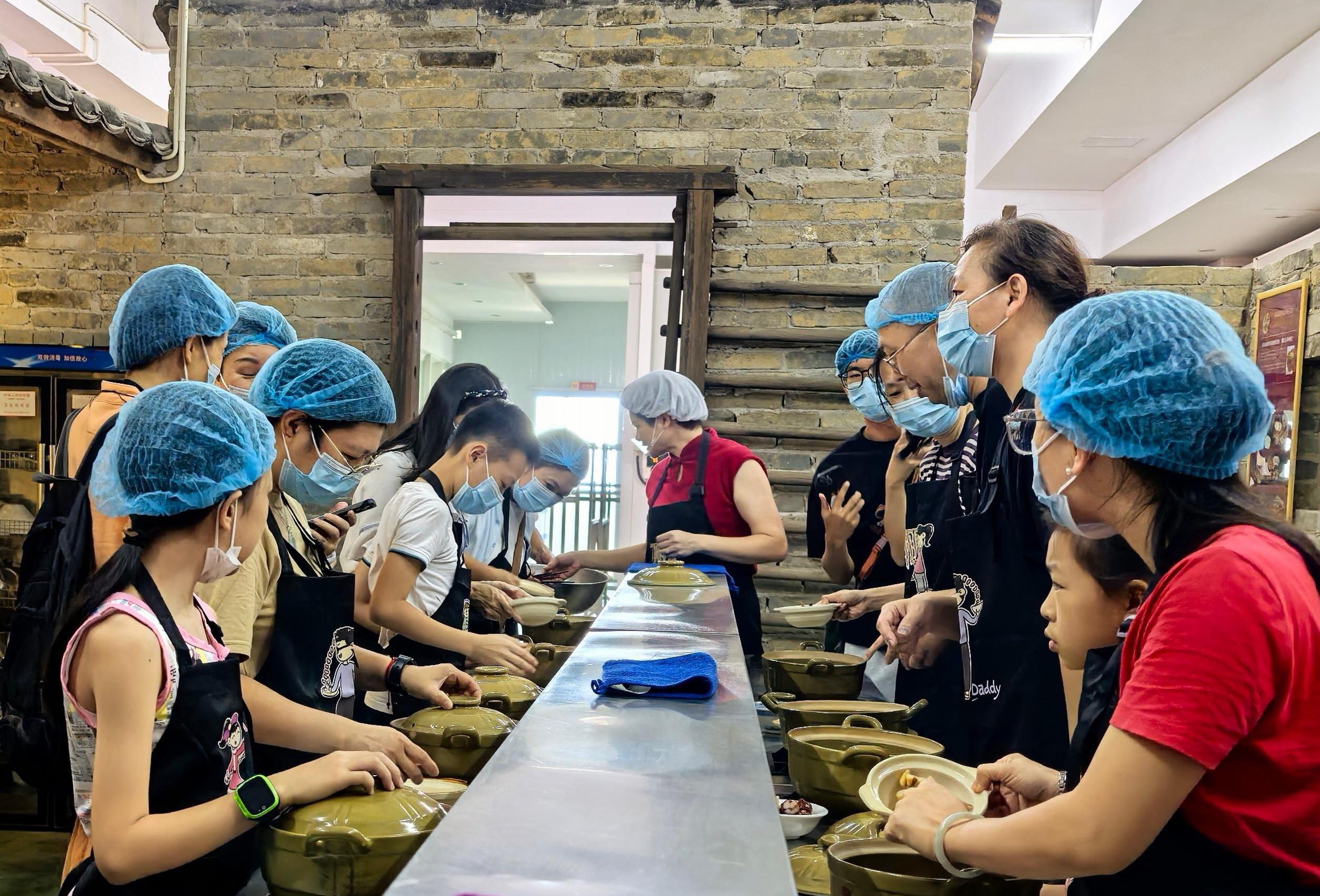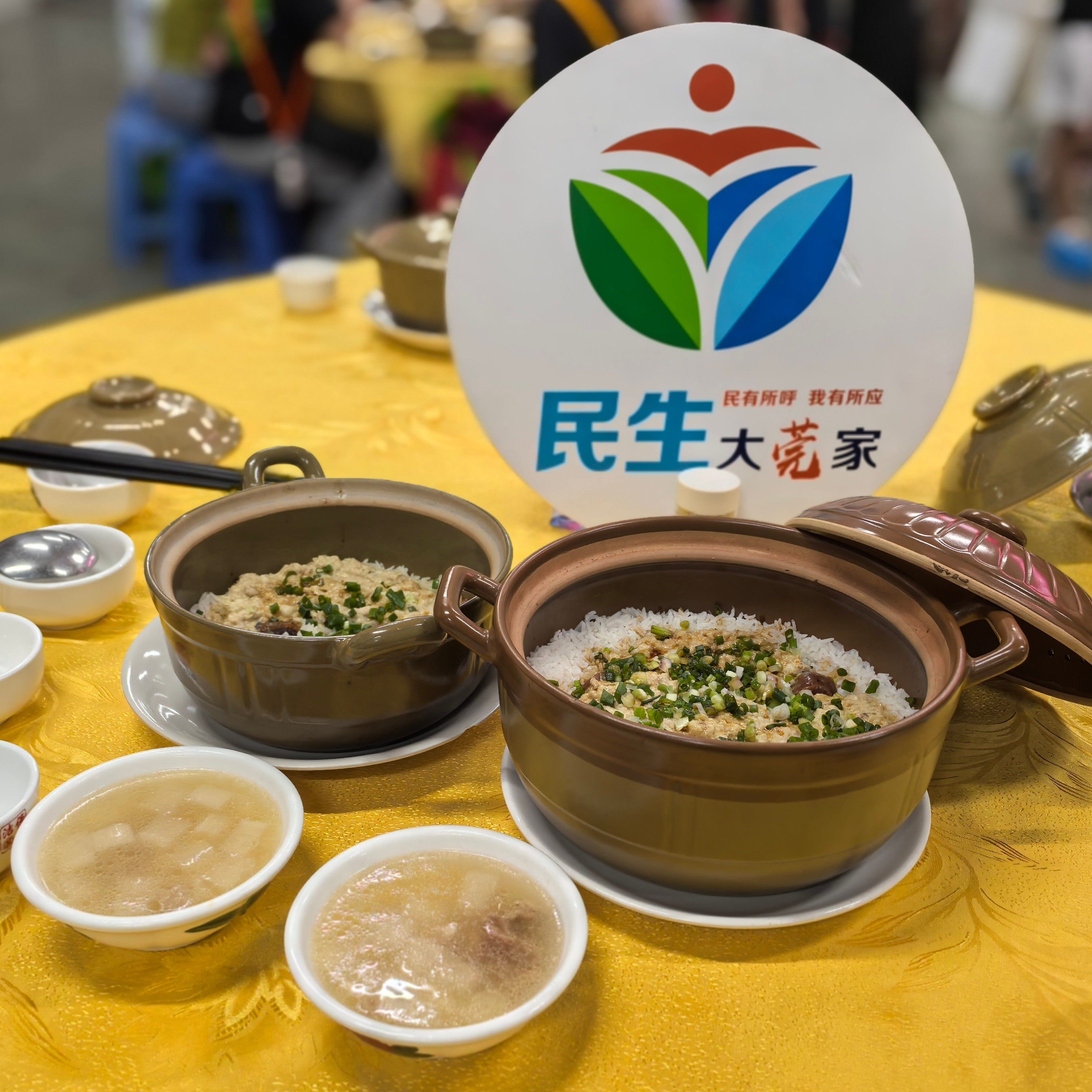 在体验了腊肠制作后,居民们开始亲手制作腊味煲仔饭。大家首先将淘洗干净的米放进瓦煲里,加入少量的水焖米饭,待米饭蒸熟后,就把事先准备好的菜铺在上面撒点葱花,放一勺黄弟秘制的酱油调味, 然后与米饭拌匀,腊味和葱的香味扑鼻而来。居民们围坐在一起品尝这份传统风味的美食,米饭细软可口、腊味唇齿留香。大家在享用美味的同时也感受着邻里之间的温暖与和谐。