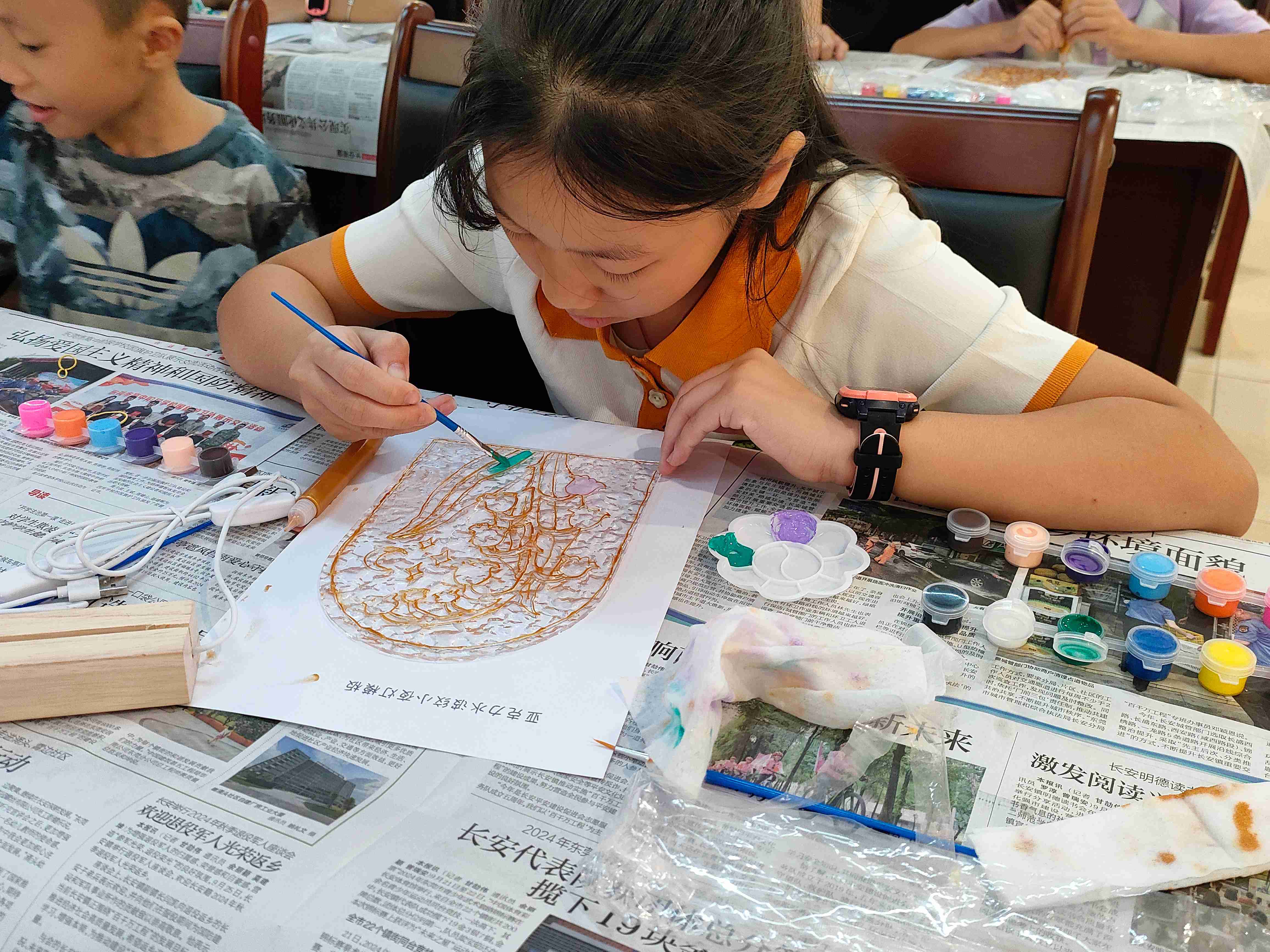 活动伊始,社工为前来参加活动的小朋友分发了DIY材料包。许多孩子在拿到材料包后都跃跃欲试,纷纷向社工询问制作方法。紧接着,社工为大家讲解了玻璃画绘制的方法和小夜灯的组装方式,然后便是孩子们动手创作的时间了。他们将透明的玻璃片置于底图之上,用金色颜料勾勒出图案轮廓,再用画笔为图案的各个部分填上颜色。孩子们不用拘泥于传统的配色要求,可以按照自己的喜好搭配颜色。从紫色的铃兰花到绿色的天空,他们尽情创作,虽然小手染成五颜六色但也乐在其中。
