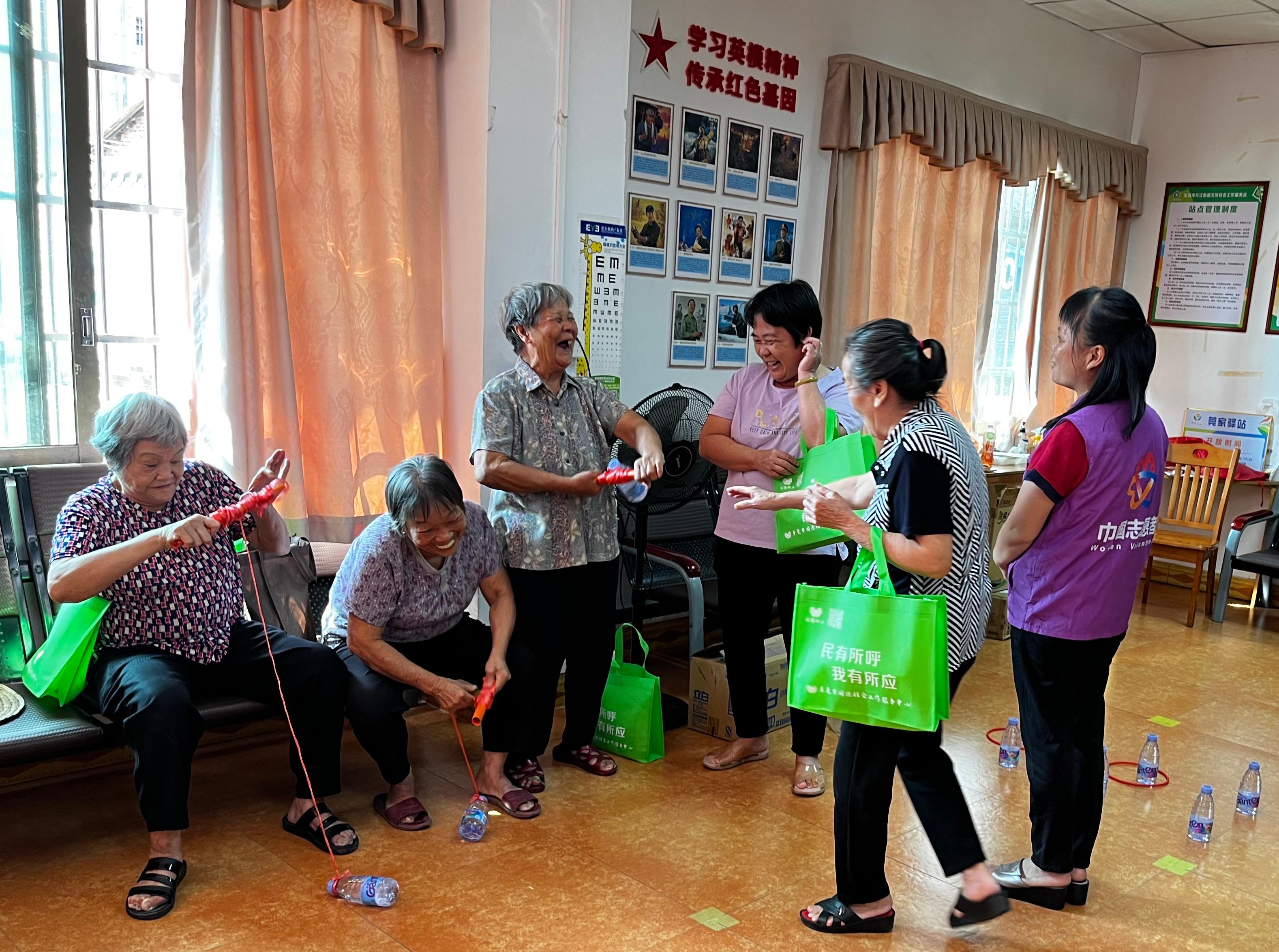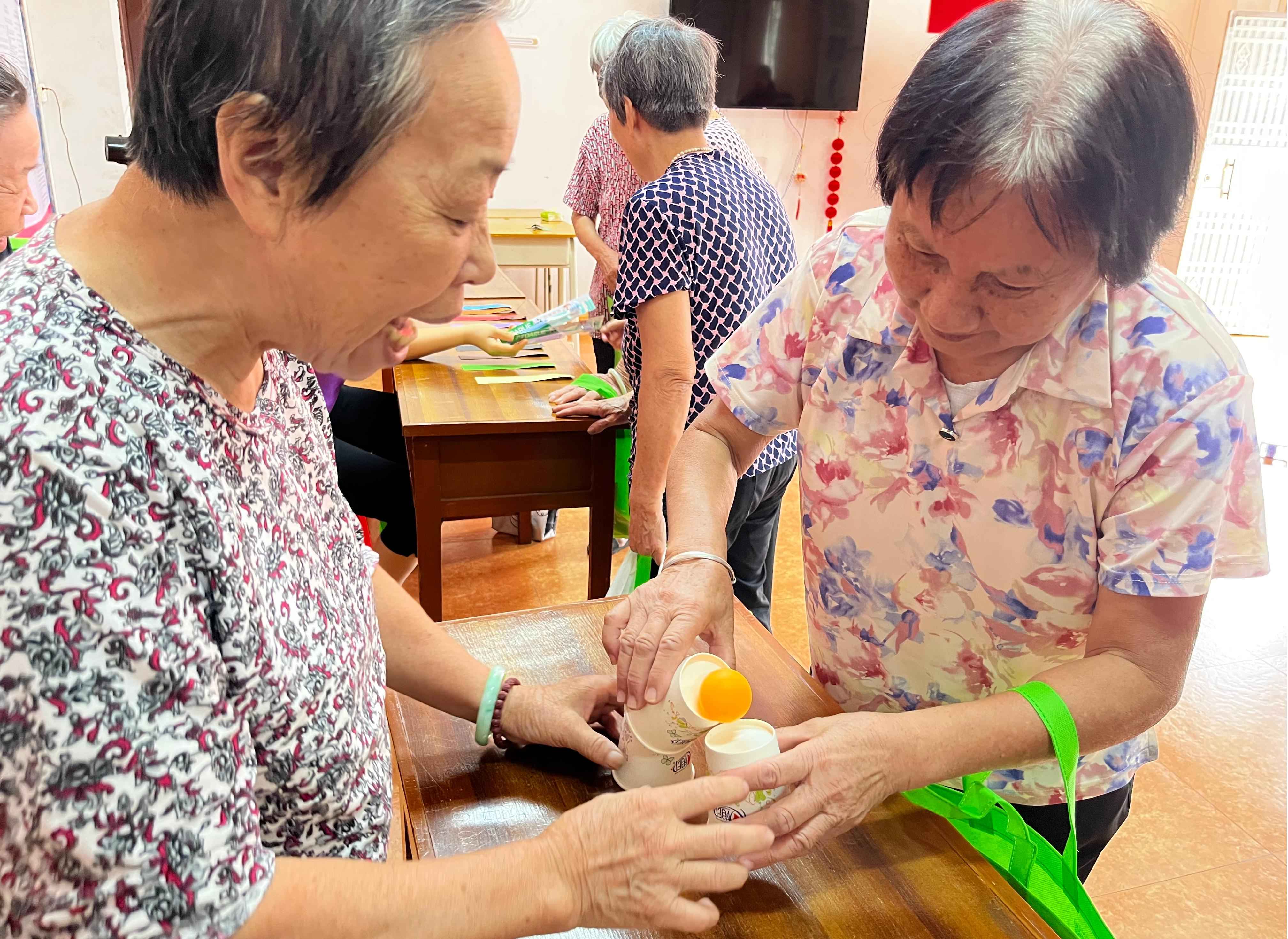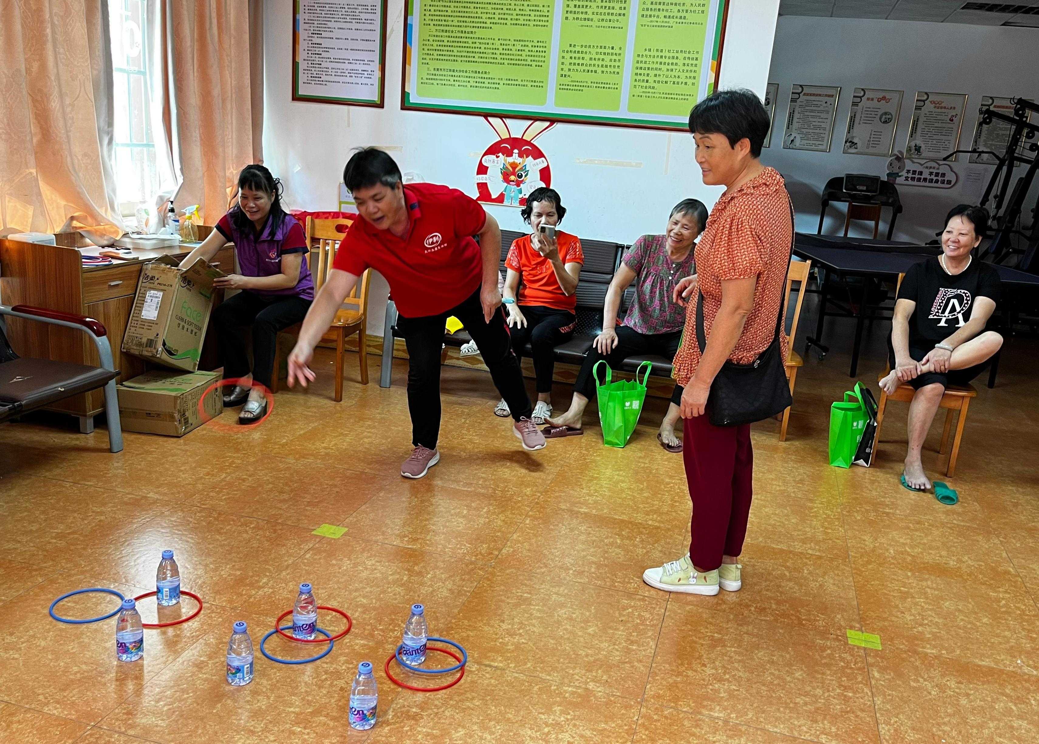 此次游园活动秉承“趣味为主,适当活动”的原则,设有快乐套圈、趣味乒乓球、颜色大比拼、趣味绕绳子等游戏项目。游戏项目的选择充分考虑到长者的身体状况,安全易操作并兼具趣味性。长者每成功体验一个游戏项目就能获得相对应的礼品。活动过程中长者们神情专注,情绪高涨,对游戏项目很是喜爱。这些游戏项目不仅训练他们的手眼协调能力,还锻炼他们的反应能力。
