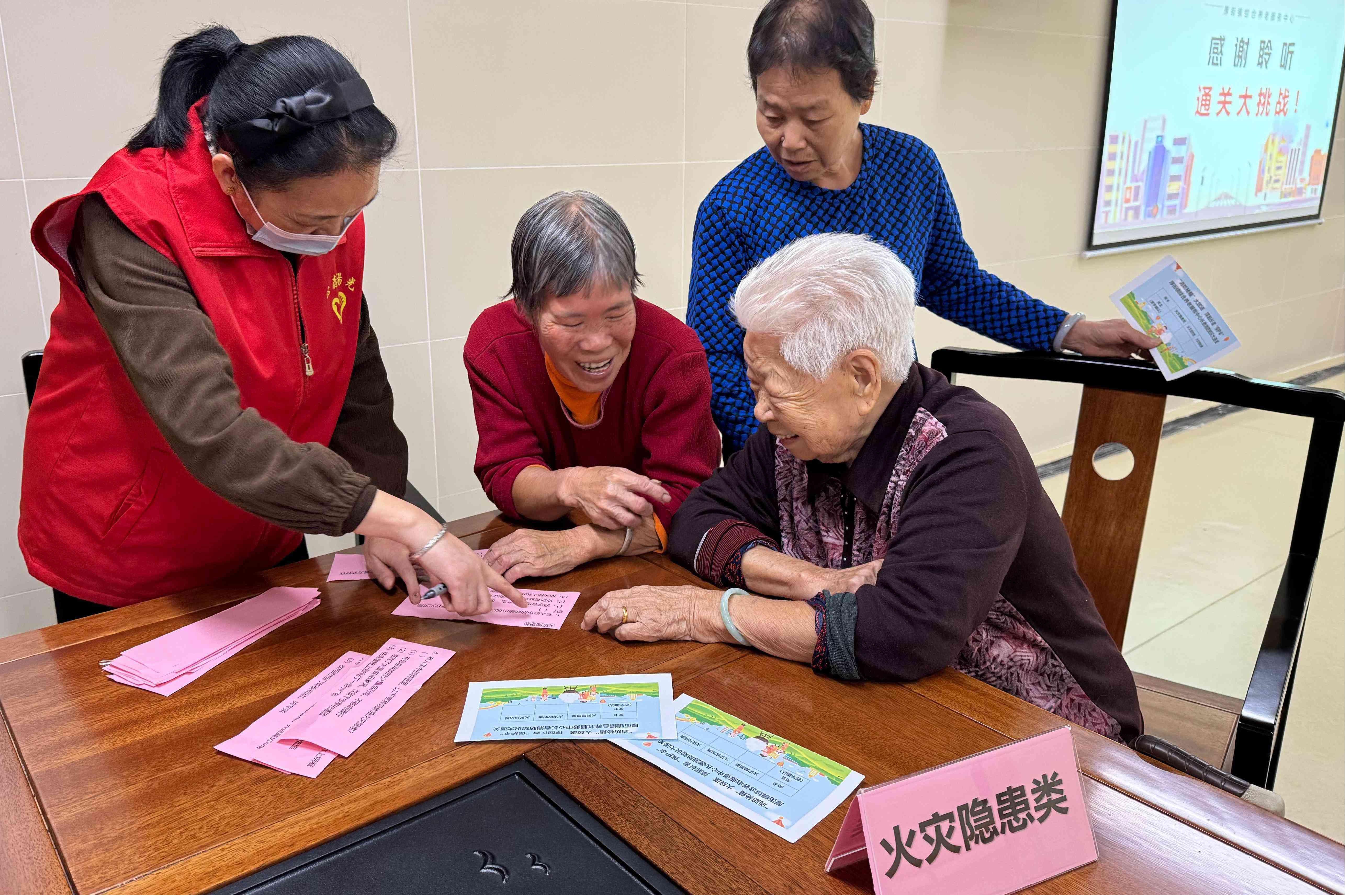 为了提高活动宣讲的互动性和趣味性,在消防安全宣讲结束后,社工还设置了消防知识点问答通关环节。问答题目涵盖了消防基础知识、火灾隐患、火灾预防、火灾应对、逃生自救等多个方面,确保了知识的全面性和挑战性。这一环节是本次活动的亮点之一,旨在通过这种问答通关的形式,不仅检验了长者的消防安全知识储备和临场应变能力,加深了对消防知识的记忆和理解,更重要的是活动以寓教于乐的方式推动了消防安全知识的普及与传播。