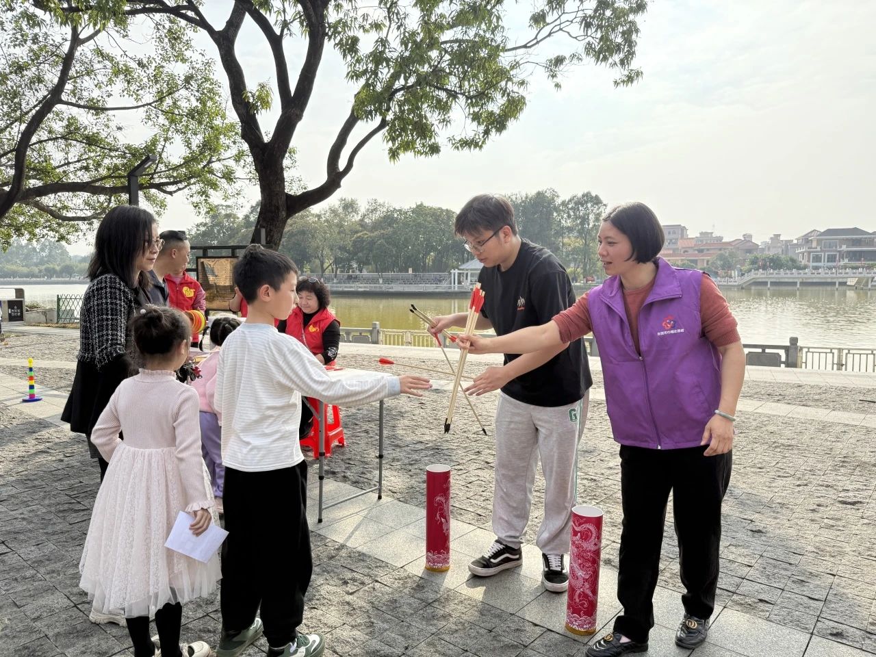 除了猜灯谜和吃汤圆外,活动现场还设立了多个游戏摊位,如投壶、抛绣球等趣味游戏,吸引了众多居民参与游玩。工作人员会为成功通关游戏的居民盖章,集齐印章还可获得相应的礼品作为奖励。这些游戏增添了节日的趣味性,让居民们在欢乐中增进了彼此之间的交流与友谊。