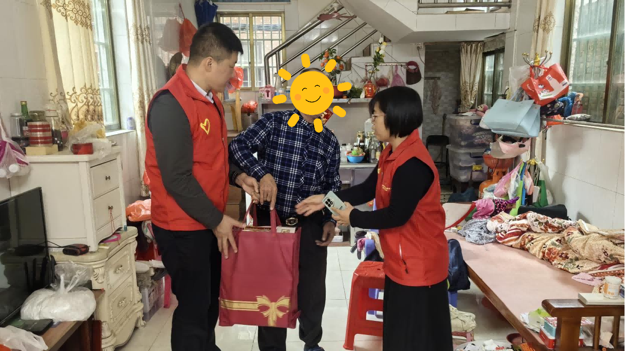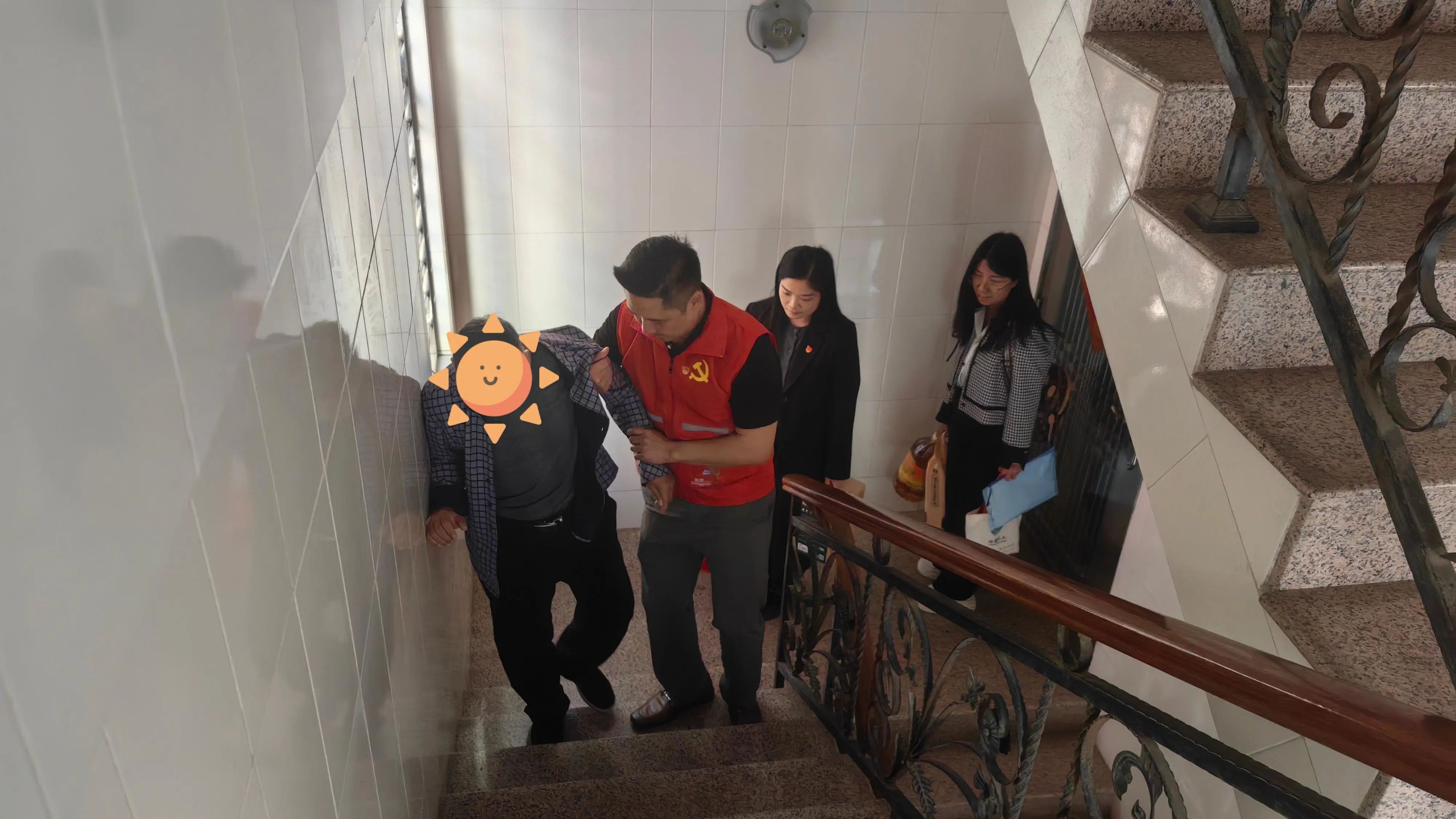 2025年3月11日,同德党支部书记黄见东在关爱新就业群体活动中协助服务对象上楼,并且联合东莞市天虹商场党支部送上慰问物品。