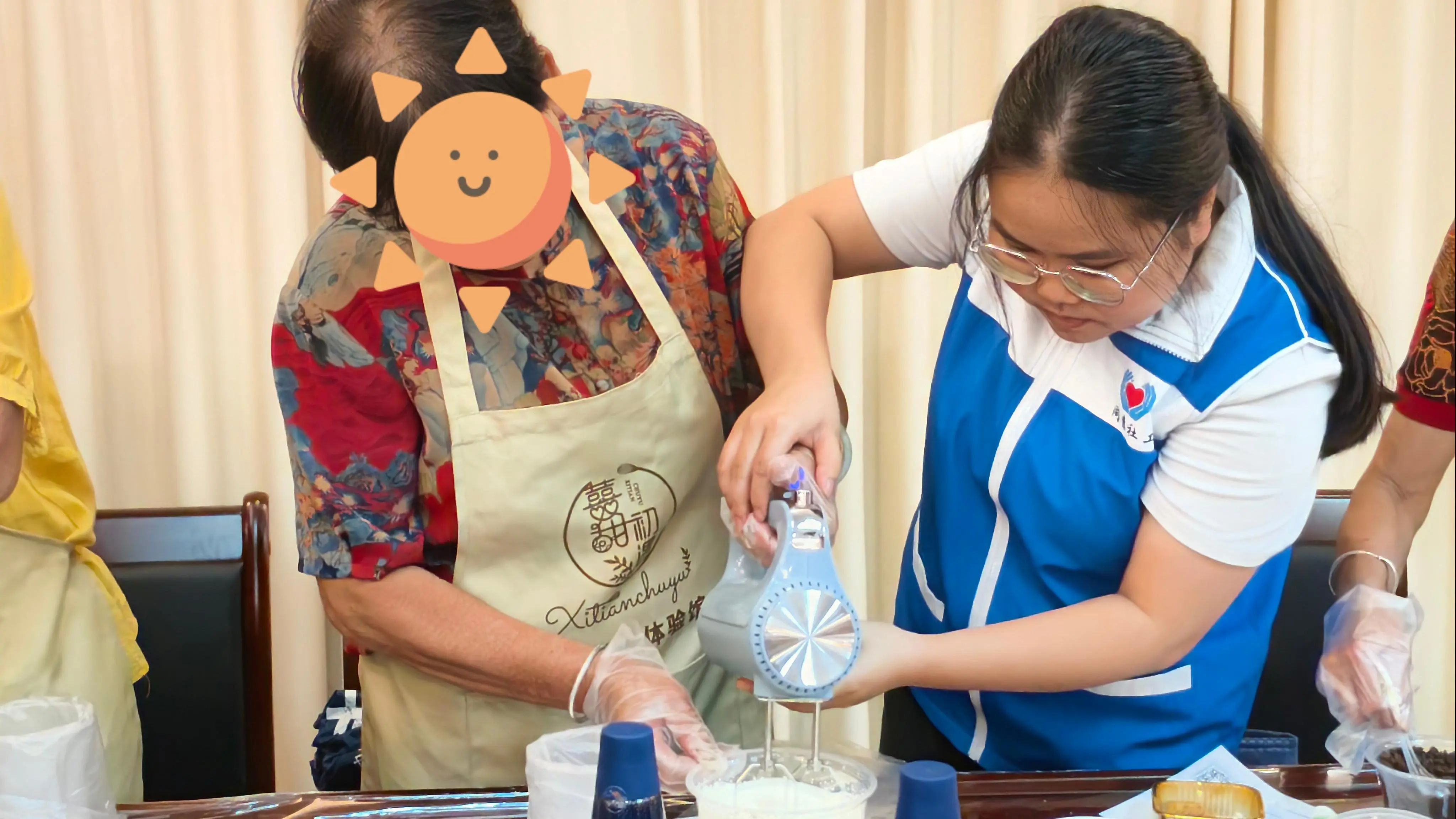 2024年10月25日同德驻长安镇“耆乐厦边”公益服务项目社工在“欢乐金秋,爱美食更爱生活”美食DIY活动中协助长者制作木糠杯。