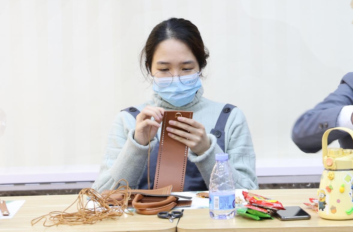 手作包环节中,老师先向大家展示了托特包的制作方法,用粗线穿过打好的孔,把布料、拉链、包带组合在一起,一个结实耐用的托特包就完成了。大家跟着老师的步骤认真制作,从一开始的小心摸索,到后来的熟能生巧,在一片欢声笑语中完成了属于自己的包包。