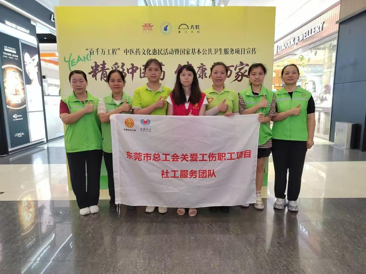 为提升工伤保险政策知晓率,扩大工伤保险覆盖面,助力企业构建和谐劳动关系,2025年7月5日,同德驻东莞市总工会关爱工伤职工项目社工联合天虹商场和黄江医院、黄江镇卫生健康局、黄江镇社区卫生服务中心在天虹商场开展了“工伤事故莫慌张,工伤政策来护航”工伤保险政策宣传活动。