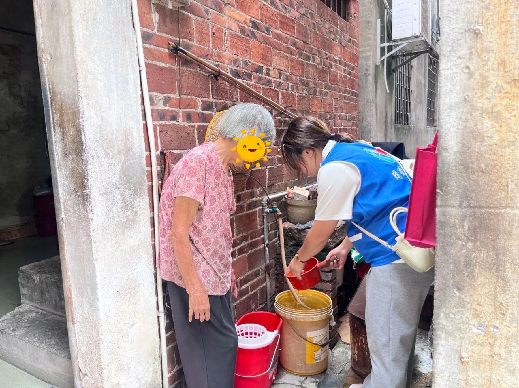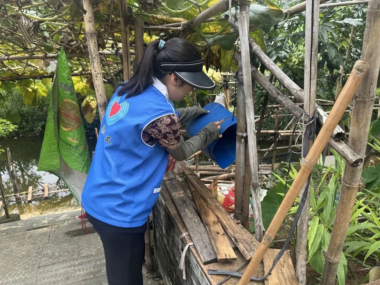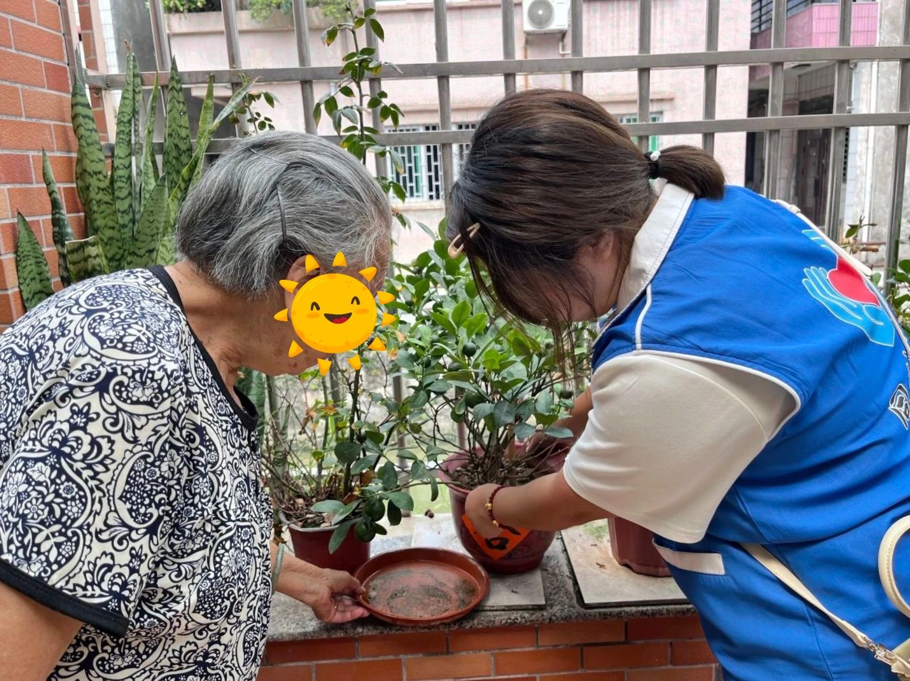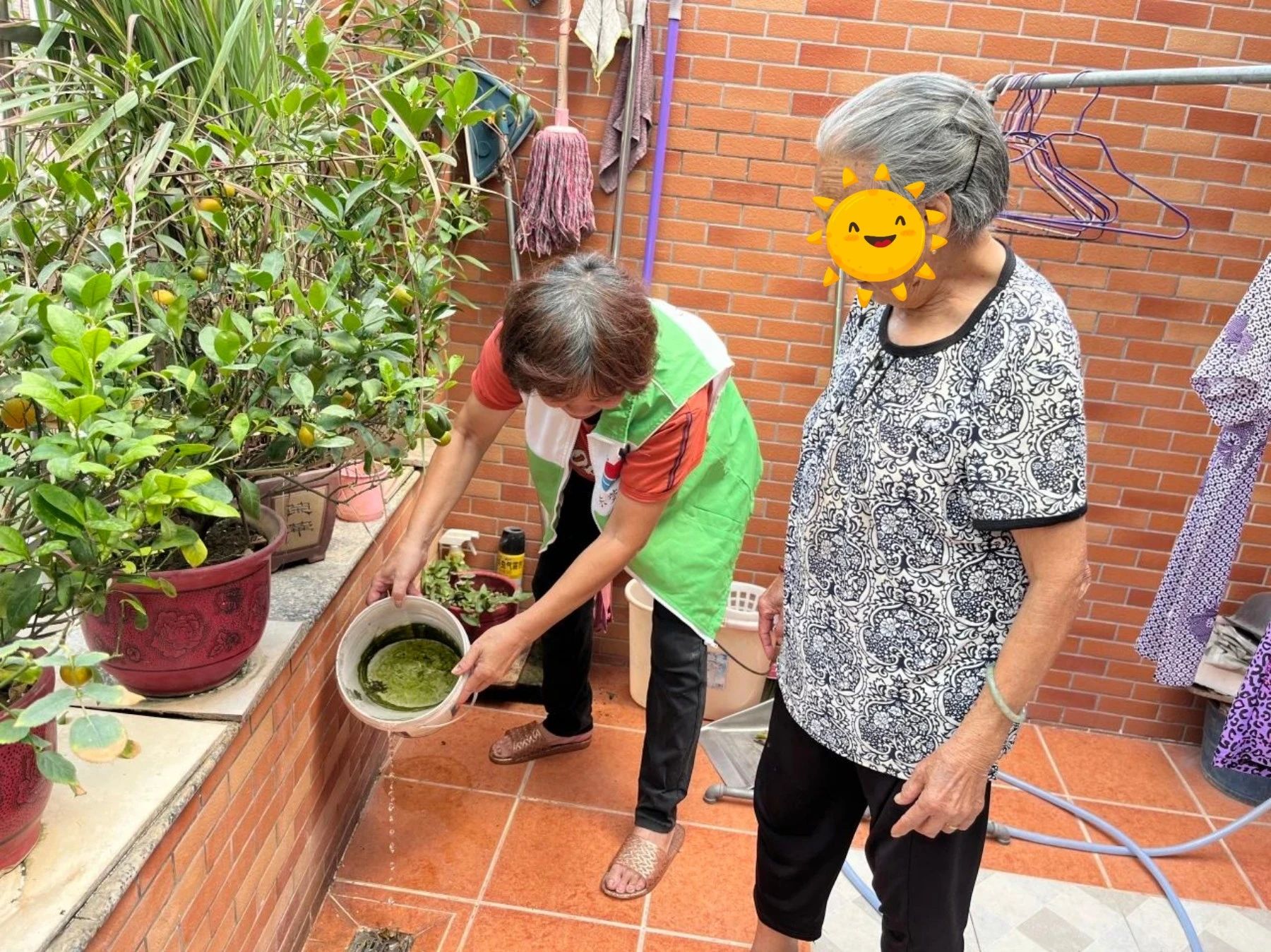 工作人员对长者居住场所进行检查,重点对花盆托盘、花瓶、水桶等易积水容器进行检查并且即使清理,进一步遏制蚊虫生长。