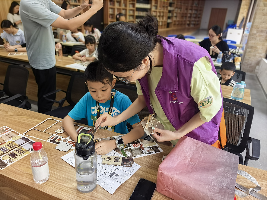 “骑楼是‘骑在街道上的房子’,楼下经商、楼上居住,既能遮阳又能挡雨,是岭南特色建筑的代表。”临展区中,老师详细讲解了骑楼的历史渊源、建筑特点与立面装饰风格。从图片中的满洲窗、浮雕、栏杆,到楼顶的山花与女儿墙,老师带领大家逐一解读骑楼的独特设计美学。为了让亲子家庭更深入地了解骑楼结构,现场还设置了亲子骑楼模型搭建环节,小朋友们在家长与志愿者的协助下,对照说明书认真拼装,从零件组合到整体成型,每一步都充满专注与期待。当一个个小巧精致的骑楼模型捧在手中时,小朋友们脸上都洋溢着成功的喜悦,对骑楼文化的认知也在动手实践中愈发深刻。
