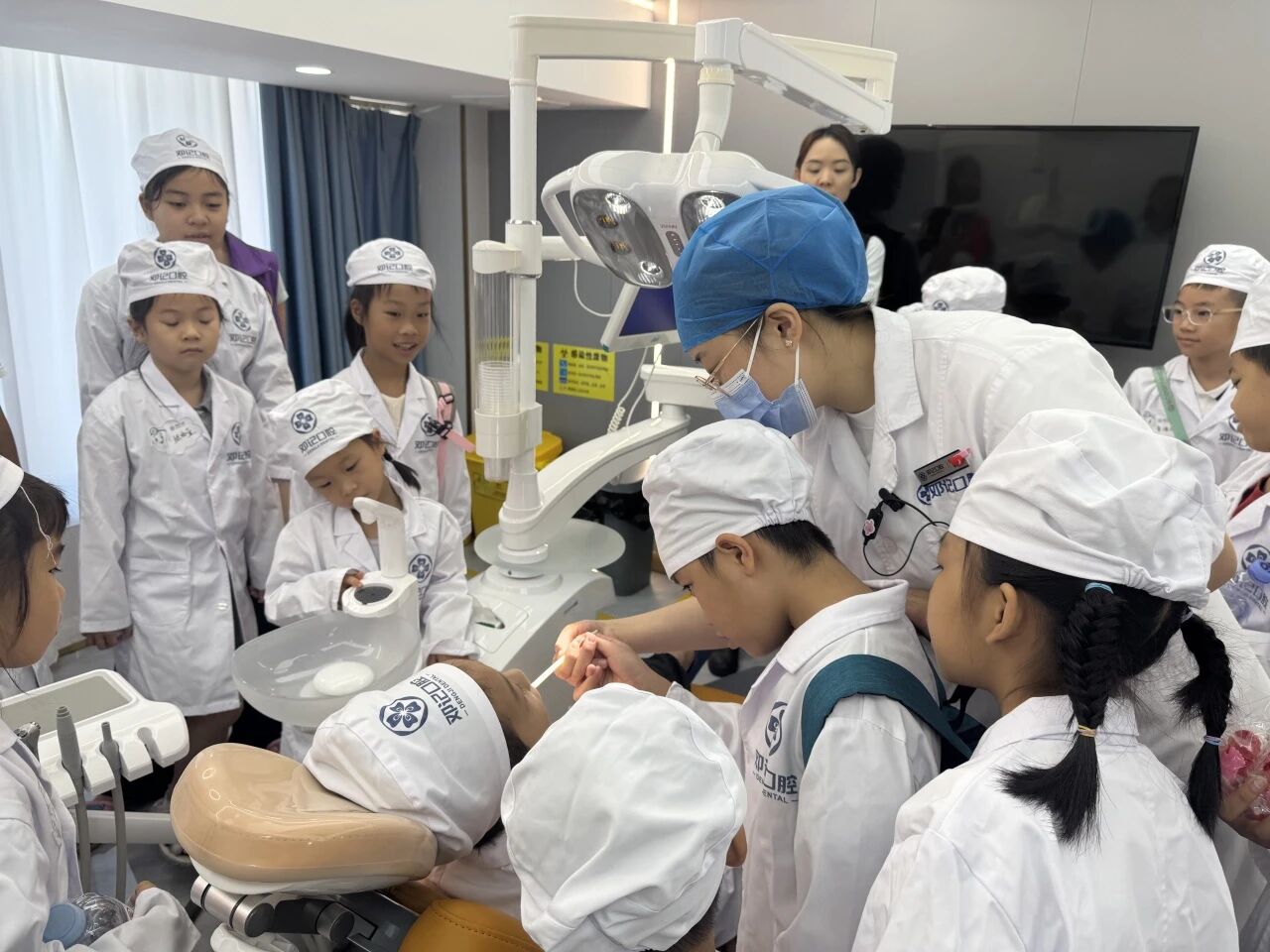 最受期待的“小小牙医”职业体验环节紧随其后。在医护人员的指导下,“小牙医”们两两一组,拿起专用检查工具,小心翼翼地为同伴检查牙齿,并像“专业牙医”一样告知同伴口腔内的状况、叮嘱其注意口腔卫生。沉浸式的体验让孩子们既了解到诊疗过程,也加深了对口腔健康重要性的认识。活动尾声,医护人员为每位参与的小朋友颁发了 “护牙小勇士” 纪念证书和小礼品。孩子们的脸上洋溢着自豪与满足。