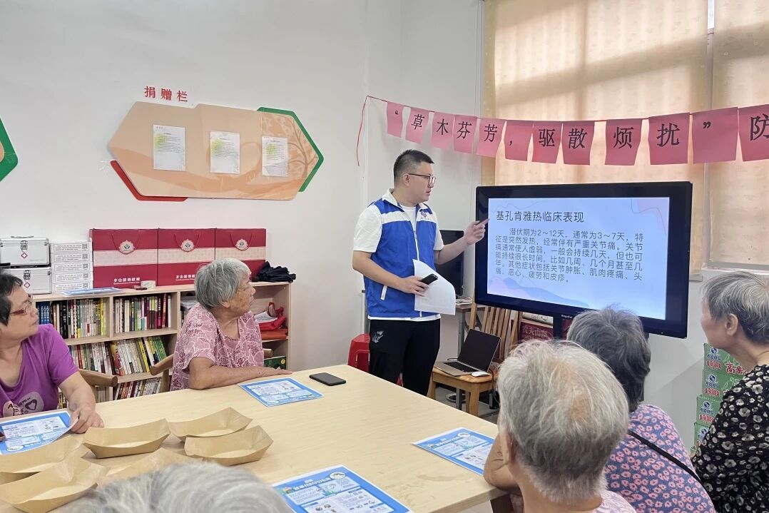 活动伊始,社工通过宣传单和PPT的方式讲解基孔肯雅热和登革热对人体的危害性、临床症状以及症状持续时间,使长者充分了解该疾病会造成人体关节肿胀、肌肉疼痛、头痛、恶心、疲劳和皮疹等影响,提高长者的警惕性。