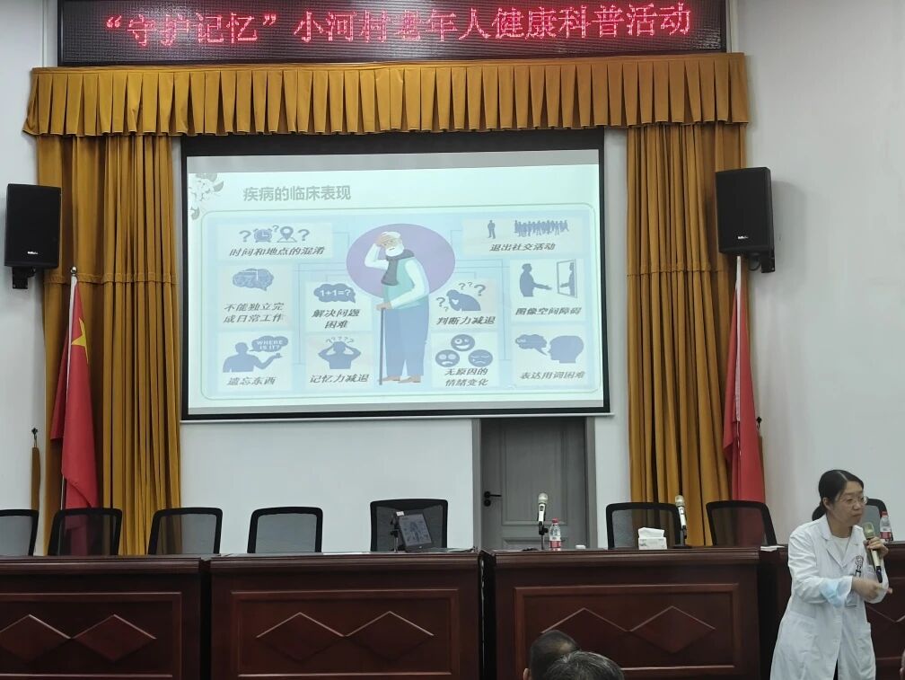 活动伊始,唐医生对“阿尔茨海默症”进行科普。其通过动画视频向大家展示阿尔茨海默症患者脑部病变过程,对比正常老化与病态记忆衰退的区别,列举了“十大早期预警信号”(如重复提问、迷路、性格突变),并强调“早筛查、早诊断”的重要性。