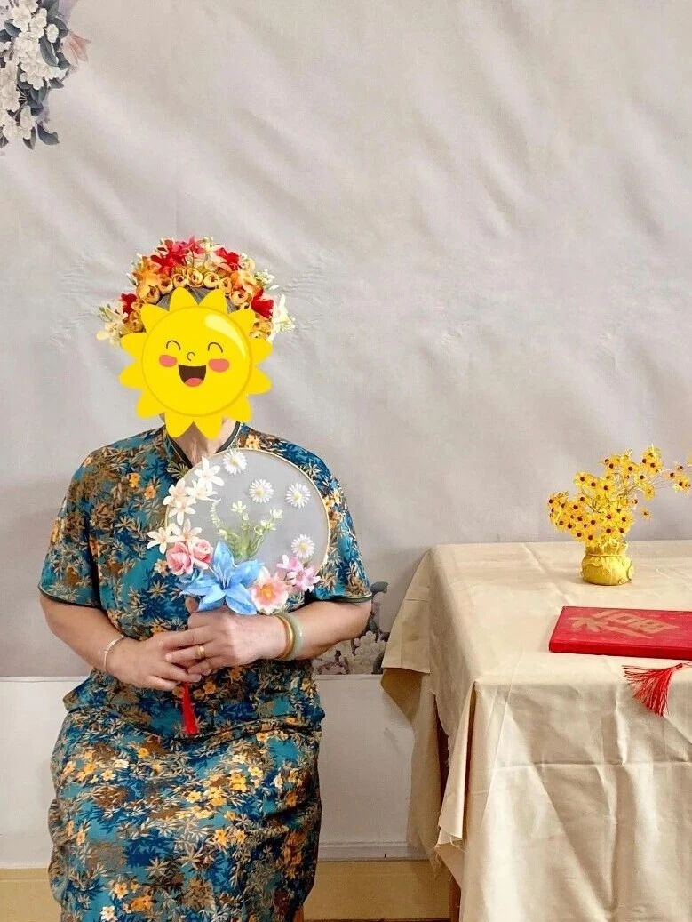 活动伊始,社工通过PPT讲解了本次拍摄活动的意义及内容,还准备好了精美的团扇、簪花、油纸伞等道具。然后,老年人们依次作简单的自我介绍。拍摄前,社工细致地帮助每一位前来参加活动的老年人化上合适的妆容、搭配雅致的头饰,银发与鲜花相映成趣。阿姨们戴上簪花后,脸上不禁浮现出羞涩又欣喜的笑容,仿佛重回青春年华。在悉心装扮后,老年人们神采奕奕地走到精心布置的拍摄背景墙前。背景墙上是古色古香的窗棂图案和淡雅的水墨画,充满了诗意与韵味。社工化身“专属摄影师”,一边亲切地与长者沟通,引导他们放松心情,摆出自然舒适的姿势,一边用心捕捉着最动人的表情和瞬间。“阿姨,看这里,笑一笑,特别美!”咔嚓咔嚓的快门声不断响起,一张张洋溢着幸福与满足的笑脸被定格成永恒的画面。今年78岁的叶奶奶说:“多少年没这么正式地拍过照了,还戴上了么漂亮的花,真是谢谢你们,太开心了!”