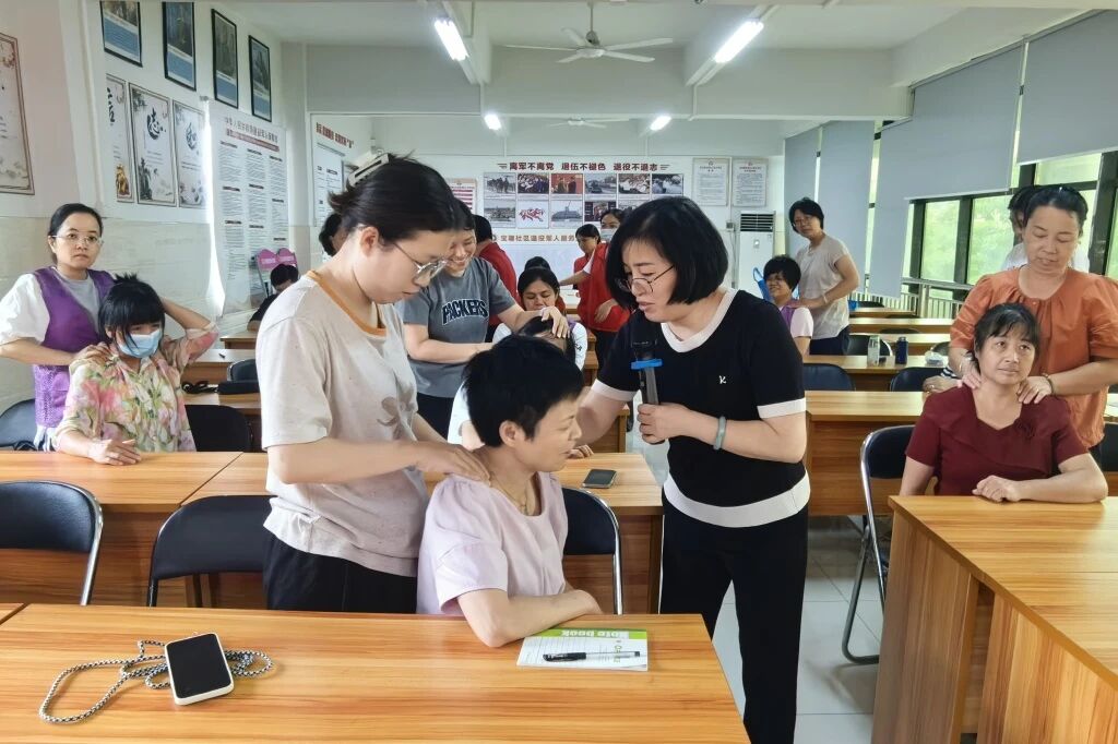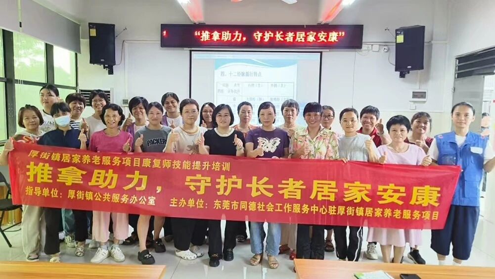 2025年9月9日,由同德驻厚街镇居家养老项目小组主办的“推拿助力,守护长者居家安康”为主题的实用技能培训活动在厚街镇宝塘社区顺利开展。本次活动特邀资深推拿师担任主讲,为厚街居家养老康复师传授推拿技法,旨在通过专业手法缓解老年人常见的脾胃不适、膝盖疼痛、肩膀酸胀等问题,进一步提升居家养老服务的质量与温度。
