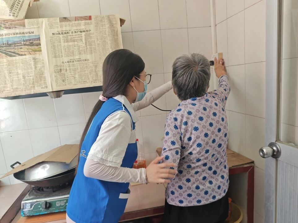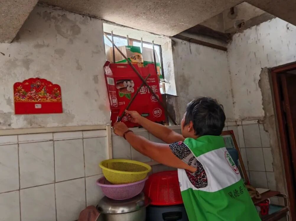 同德驻万江街道居家养老项目社工团队重点排查了老旧房屋屋顶防漏、阳台坠物、电路安全等隐患,对排水不畅的住户及时清理淤塞。护工每去到一户老人家中,不仅要加固老人的老旧门窗,还将门口或者楼顶的杂物清理好,随后叮嘱老人这次台风比较危险,非必要不出门,一定要做好预防措施。