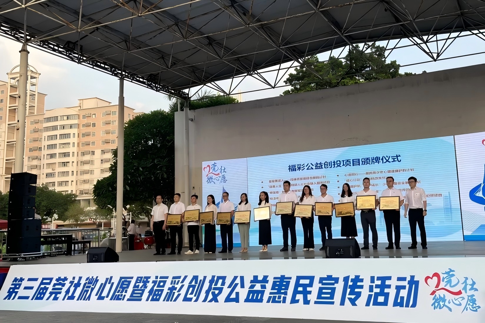 开始,主持人介绍了活动有3项议程,第一项议程是举行第三届“莞社微心愿”项目代表签约仪式;第二项议程是开展第三届“莞社微心愿”活动、福彩公益创投活动颁牌仪式;第三项议程是开展惠民宣传摊位展示活动。
