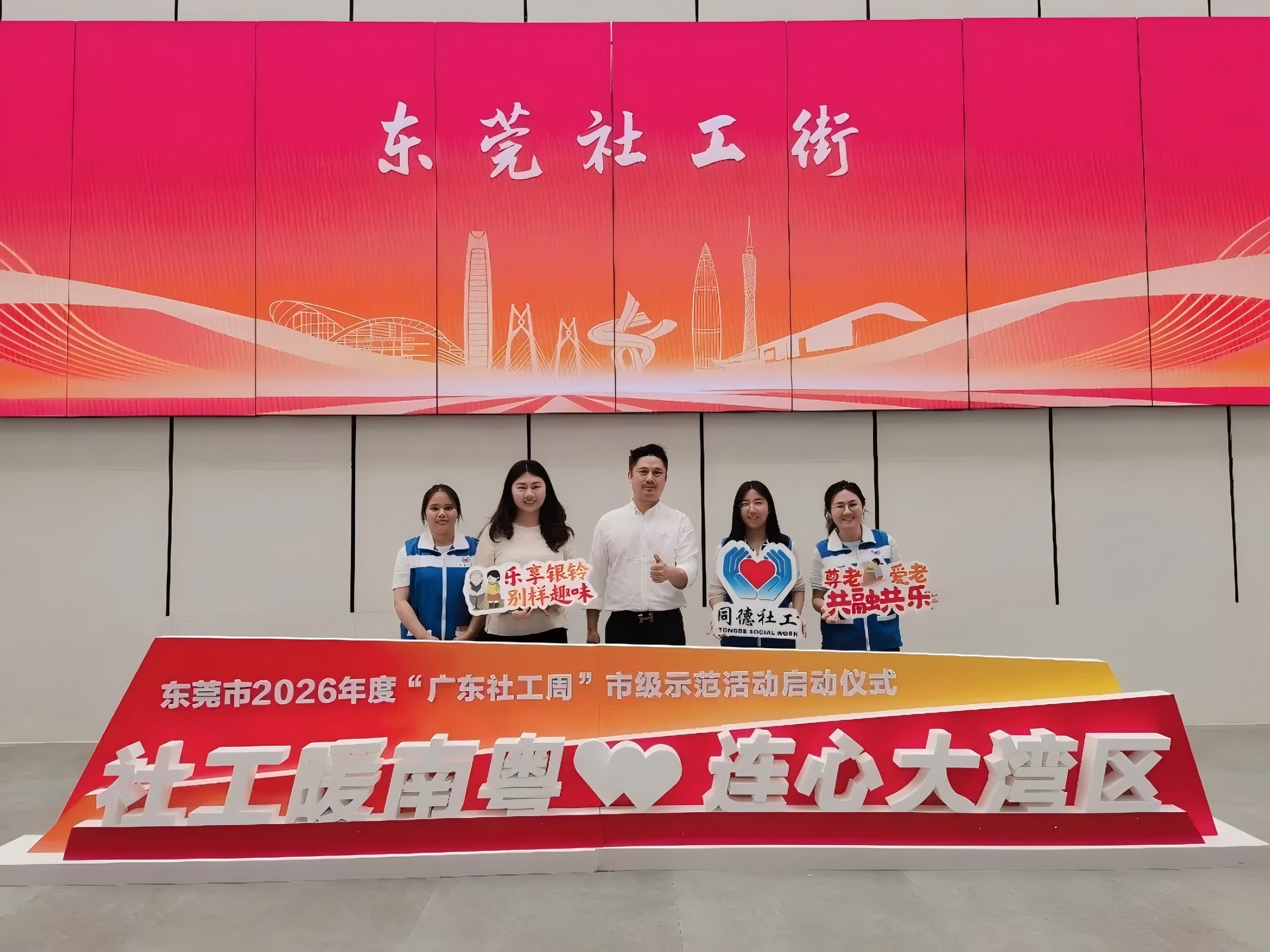 3月17日,2026年度“广东社工周”东莞市级示范活动正式启动。本次主题为“社工暖南粤 连心大湾区”活动由中共东莞市委社会工作部主办,紧扣“智创优品、和美宜居”现代化新东莞建设目标,凝聚社工人才力量为“十五五”开局赋能。深耕东莞社工领域十三年的东莞市同德社会工作服务中心(以下简称“同德中心”)受邀参与,总干事黄见东出席启动仪式,同德中心作为社会工作服务机构代表、东莞市总工会“关爱工伤职工”项目作为市直项目代表在“东莞社工街”精彩亮相,践行“社工暖南粤”的服务初心。