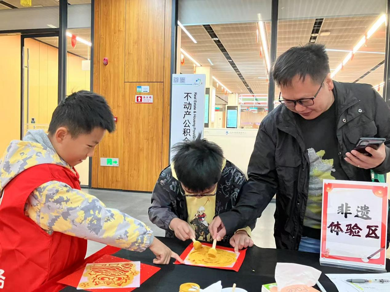 活动期间,墨香四溢、年味浓郁,非遗镂空拓印体验区人头攒动。市民在政务社工与志愿者老师的指导下,亲手拓印专属“福”字,将承载吉祥寓意的文化作品带回家。