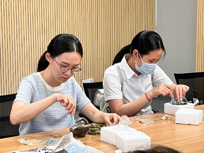 首先,社工通过工作和生活场景下的沟通情境,引入结构式倾听的概念和知识,通过“接纳情绪、搞清事实、确定期待”三个步骤,帮助参加者听懂话外之音,更好地回应沟通对象。在学习了理论知识后,社工模拟了两个沟通场景,让参加者运用学到的知识进行分析和回应,学以致用,加深印象。最后,为深化活动主题,增加趣味性,活动特别安排了多肉微景观手工环节,参加者们在轻松愉悦的氛围中动手种植多肉,摆放可爱的小摆件,在动手的同时放松身心,释放压力。