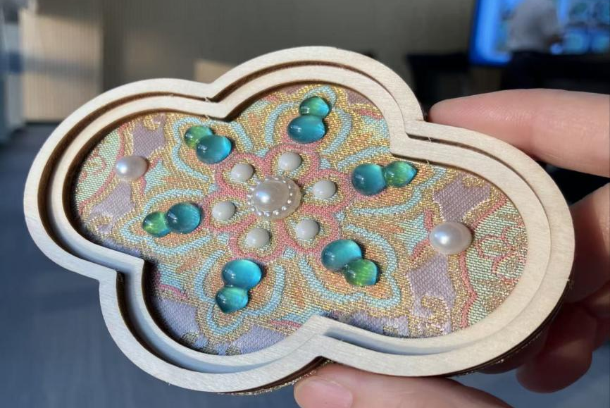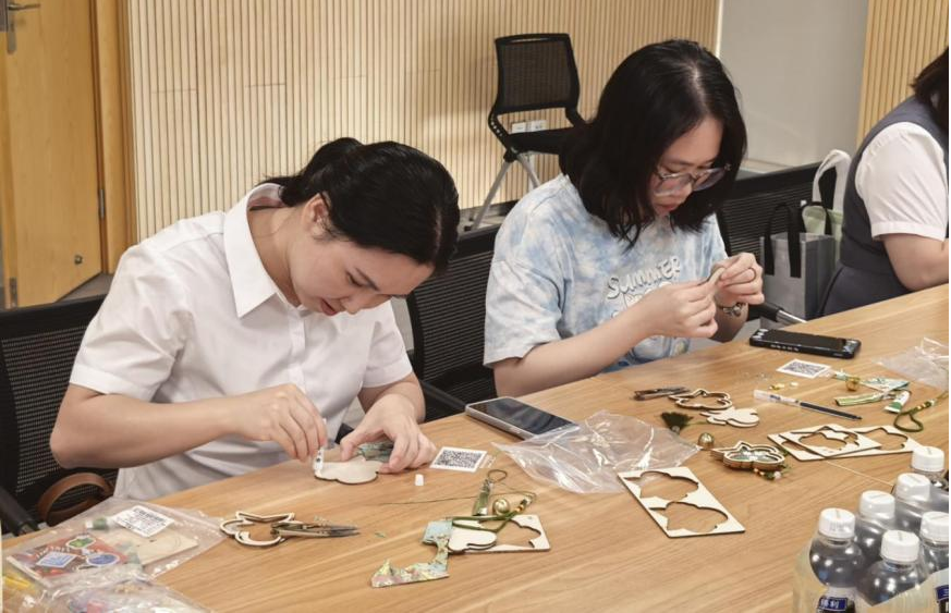 随后,社工以织锦冰箱贴这一独特载体,先引导参与者觉察情绪根源、掌握科学疏导技巧。大家将刚学到的思维导图思维融入设计构思,用分支拓展的方式梳理情绪主题与元素构成,一个个充满巧思的设计在指尖诞生。活动还特别选拔15位表现优秀的参与者担任“互助小导师”,协助其他伙伴完成创作,现场洋溢着互助友爱的温暖氛围。