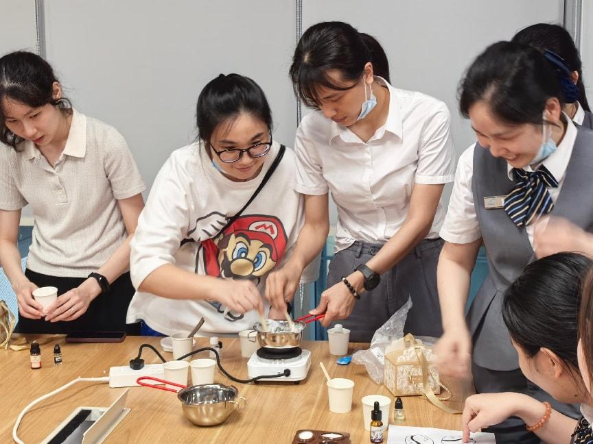 最后是咖啡手工皂环节,将参加者分为两组,大家各自分工,相互协作,共同制作手工皂。手工皂冷却所需时间较长,参加者在等待的过程中相互交流互动,分享手工皂制作的技巧,在手工环节中运用学习到的团队协作知识,加强赋能效果。
